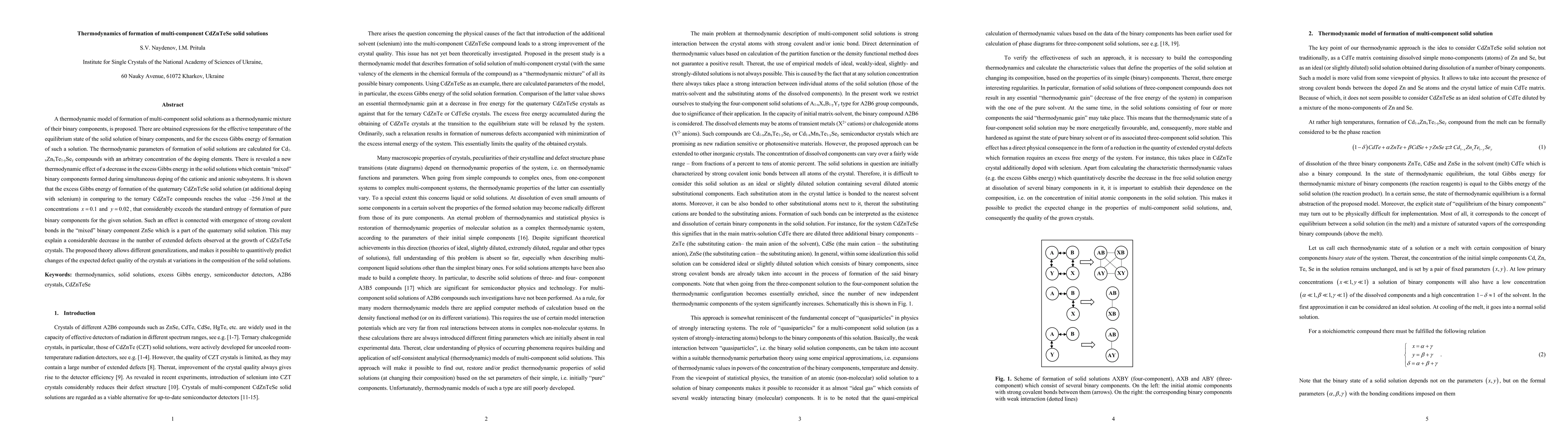 This paper proposes a thermodynamic model for the formation of multi-component CdZnTeSe solid solutions, revealing a decrease in excess Gibbs energy due to strong covalent bonds in mixed binary components, which correlates with fewer crystal defects. The model quantitatively predicts defect quality changes with varying composition.