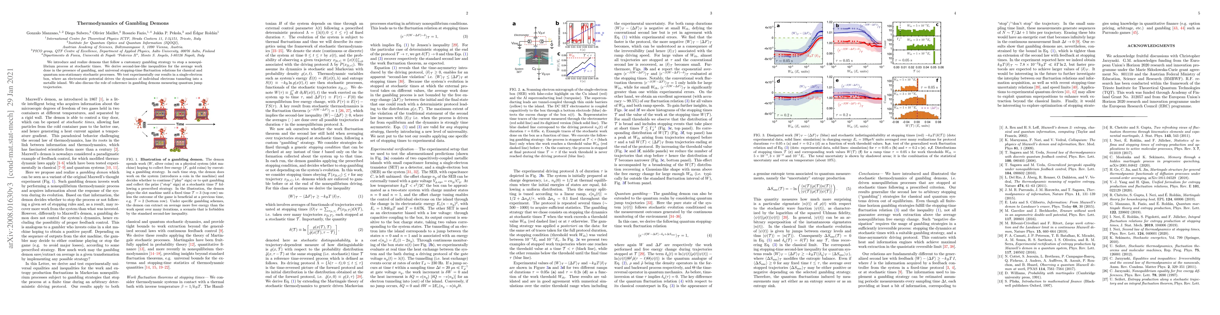 We introduce and realize demons that follow a customary gambling strategy to stop a nonequilibrium process at stochastic times. We derive second-law-like inequalities for the average work done in the presence of gambling, and universal stopping-time fluctuation relations for classical and quantum non-stationary stochastic processes. We test experimentally our results in a single-electron box, where an electrostatic potential drives the dynamics of individual electrons tunneling into a metallic island. We also discuss the role of coherence in gambling demons measuring quantum jump trajectories.