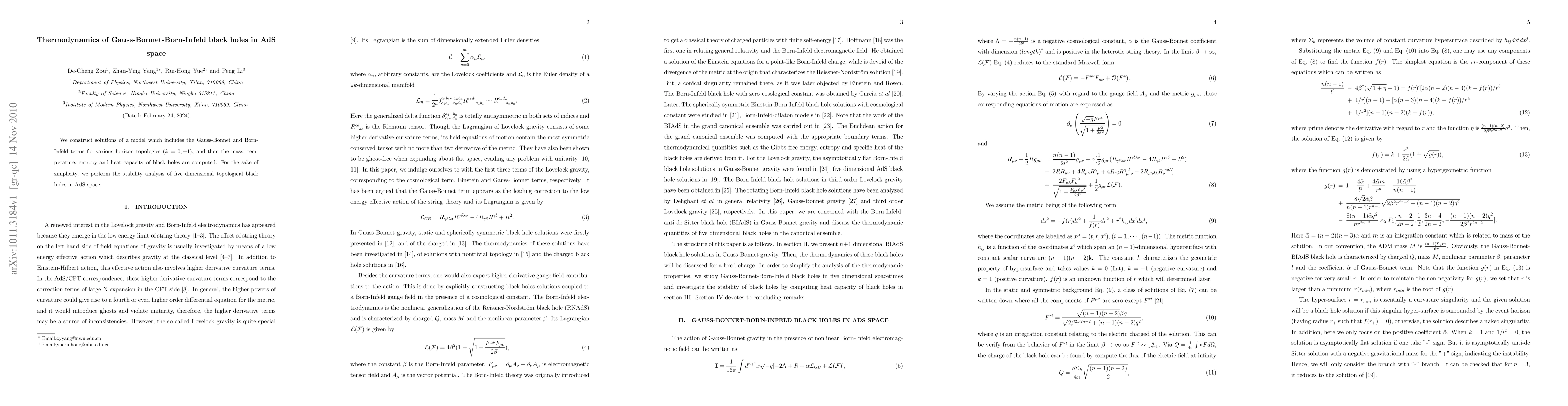 This paper constructs Gauss-Bonnet-Born-Infeld black hole solutions in AdS space with various horizon topologies, and computes their mass, temperature, entropy, and heat capacity. Stability analysis is performed for five-dimensional black holes in this context.