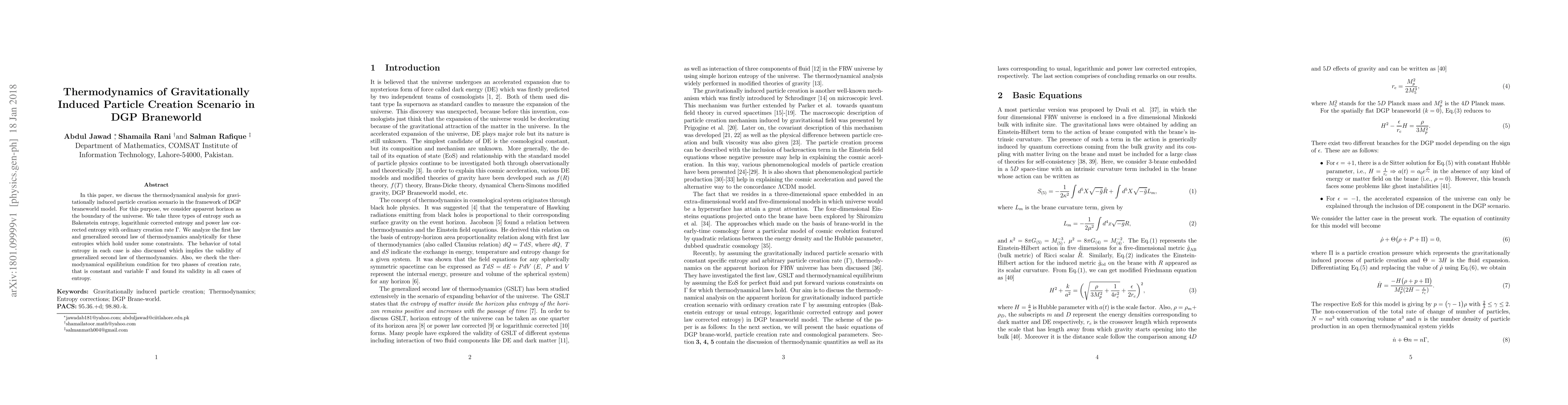 This paper analyzes the thermodynamics of particle creation in the DGP braneworld model, focusing on the apparent horizon as the universe's boundary. It examines the first law and generalized second law of thermodynamics using various entropy types, confirming the validity of the generalized second law and thermodynamic equilibrium under both constant and variable creation rates.