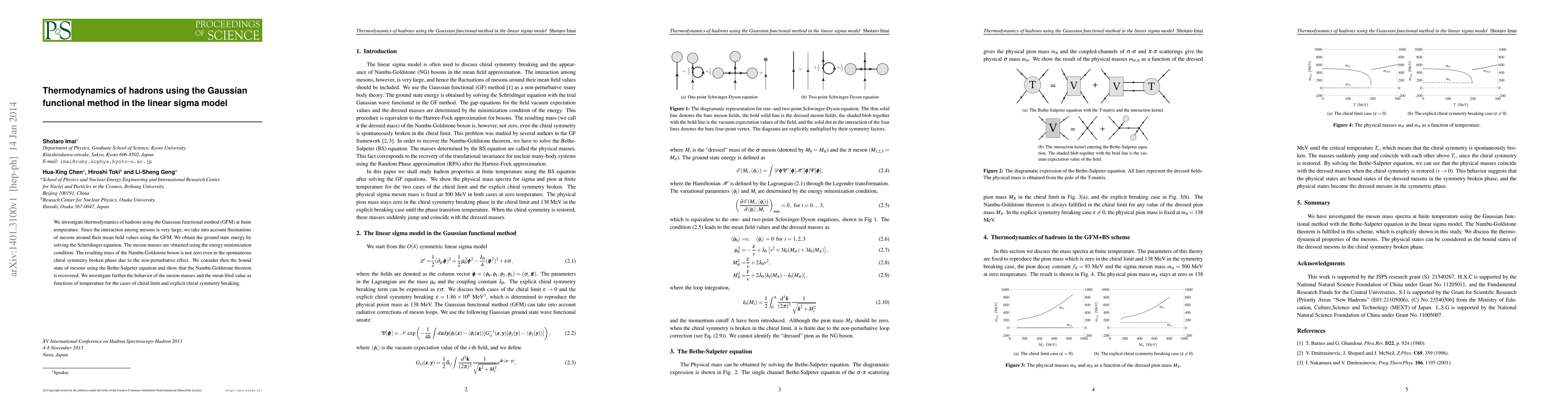We investigate thermodynamics of hadrons using the Gaussian functional method (GFM) at finite temperature. Since the interaction among mesons is very large, we take into account fluctuations of mesons around their mean field values using the GFM. We obtain the ground state energy by solving the Schr\"{o}dinger equation. The meson masses are obtained using the energy minimization condition. The resulting mass of the Nambu-Goldstone boson is not zero even in the spontaneous chiral symmetry broken phase due to the non-perturbative effect. We consider then the bound state of mesons using the Bethe-Salpeter equation and show that the Nambu-Goldstone theorem is recovered. We investigate further the behavior of the meson masses and the mean filed value as functions of temperature for the cases of chiral limit and explicit chiral symmetry breaking.