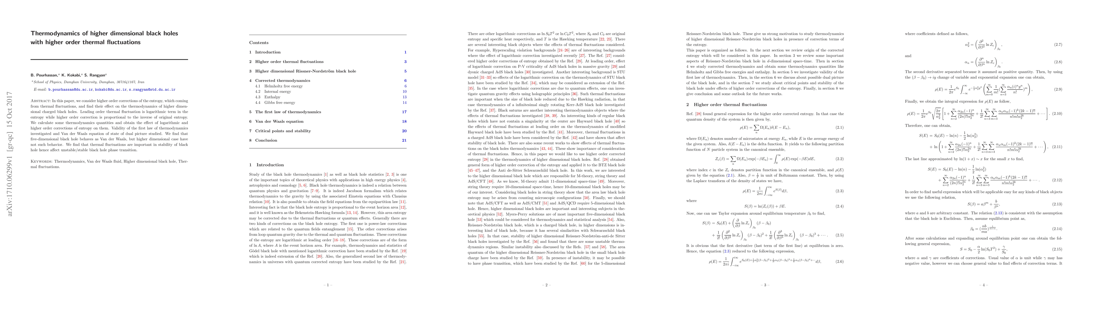 This paper investigates higher order thermal fluctuation corrections to the entropy of higher dimensional charged black holes, finding significant effects on their thermodynamic quantities. It reveals that while five-dimensional black holes follow a Van der Waals equation of state, higher dimensions do not, and thermal fluctuations critically influence black hole stability and phase transitions.