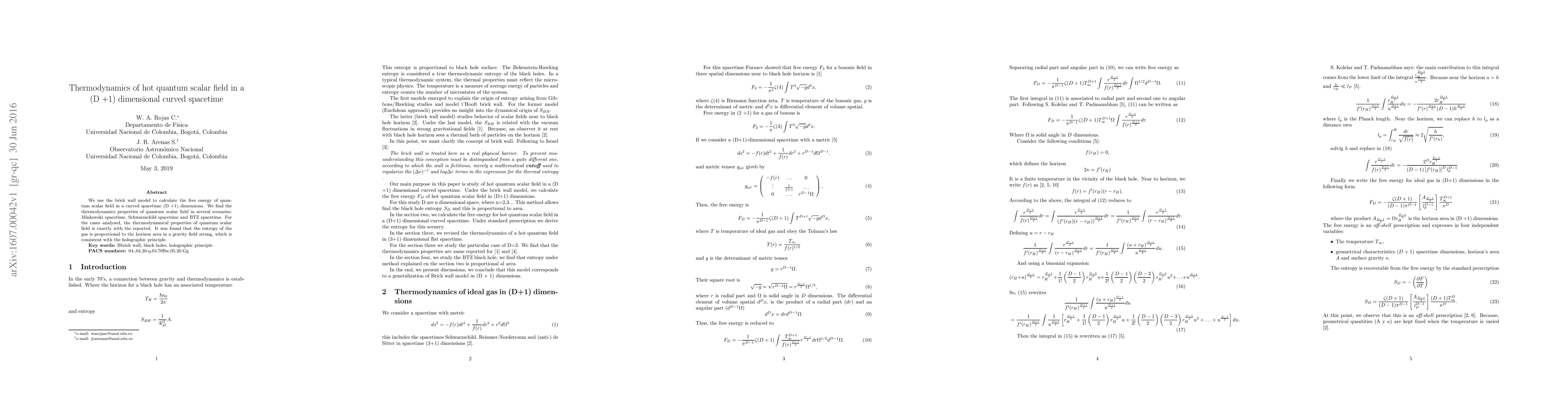 We use the brick wall model to calculate the free energy of quantum scalar field in a curved spacetime (D +1) dimensions. We find the thermodynamics properties of quantum scalar field in several scenaries: Minkowski spacetime, Schwarzschild spacetime and BTZ spacetime. For the cases analysed, the thermodynamical properties of quantum scalar field is exactly with the reported. It was found that the entropy of the gas is proportional to the horizon area in a gravity field strong, which is consistent with the holographic principle.