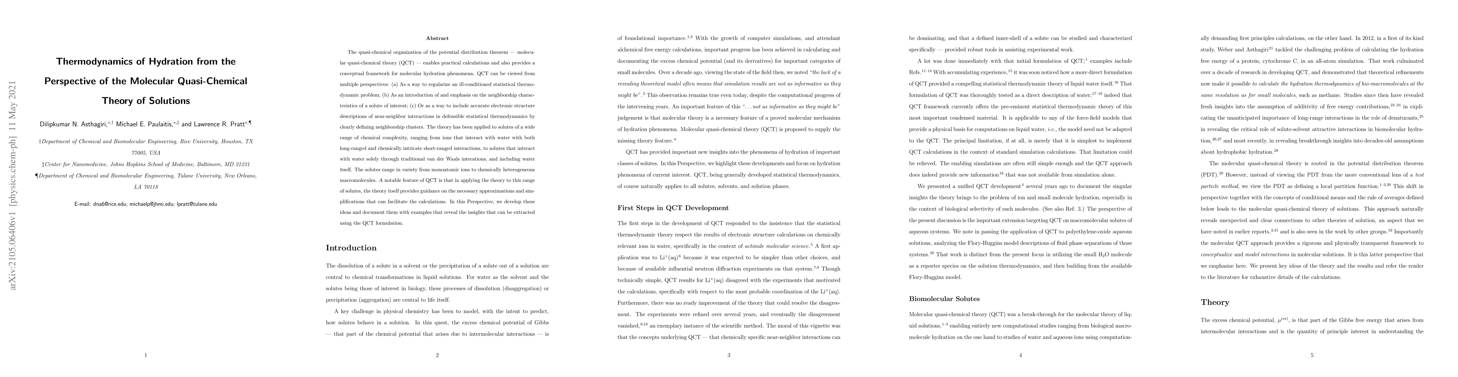 The quasi-chemical organization of the potential distribution theorem -- molecular quasi-chemical theory (QCT) -- enables practical calculations and also provides a conceptual framework for molecular hydration phenomena. QCT can be viewed from multiple perspectives: (a) As a way to regularize an ill-conditioned statistical thermodynamic problem; (b) As an introduction of and emphasis on the neighborship characteristics of a solute of interest; (c) Or as a way to include accurate electronic structure descriptions of near-neighbor interactions in defensible statistical thermodynamics by clearly defining neighborship clusters. The theory has been applied to solutes of a wide range of chemical complexity, ranging from ions that interact with water with both long-ranged and chemically intricate short-ranged interactions, to solutes that interact with water solely through traditional van~der~Waals interations, and including water itself. The solutes range in variety from monoatomic ions to chemically heterogeneous macromolecules. A notable feature of QCT is that in applying the theory to this range of solutes, the theory itself provides guidance on the necessary approximations and simplifications that can facilitate the calculations. In this Perspective, we develop these ideas and document them with examples that reveal the insights that can be extracted using the QCT formulation.