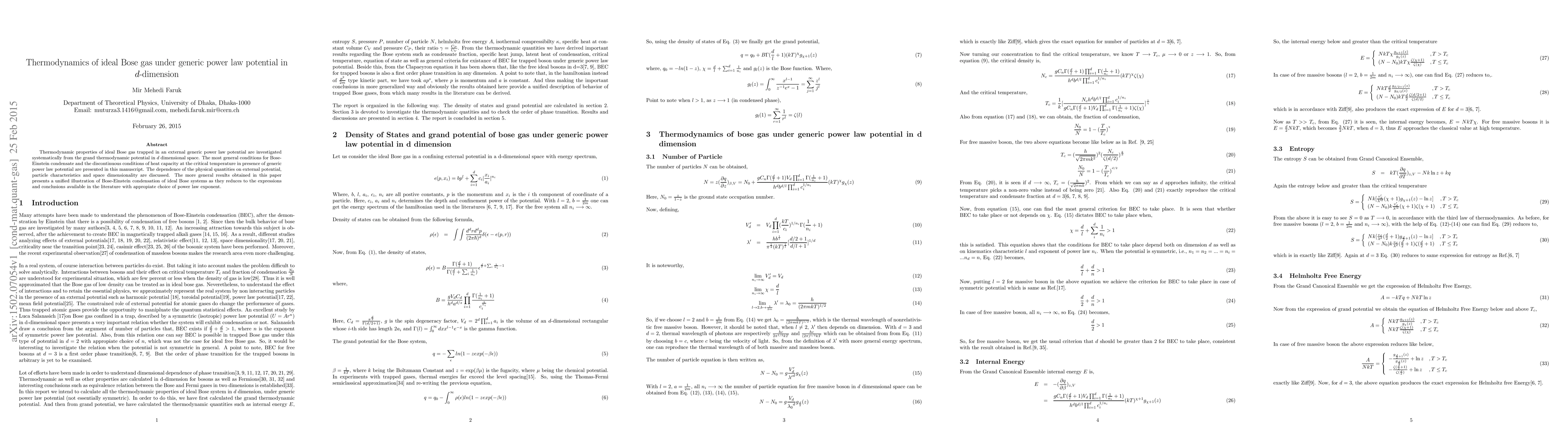 This paper investigates the thermodynamic properties of an ideal Bose gas under a generic power law potential in $d$ dimensions, deriving conditions for Bose-Einstein condensation and analyzing the heat capacity's discontinuity at the critical temperature. The study provides a unified view of Bose-Einstein condensation, showing how it aligns with existing literature for specific power law exponents.