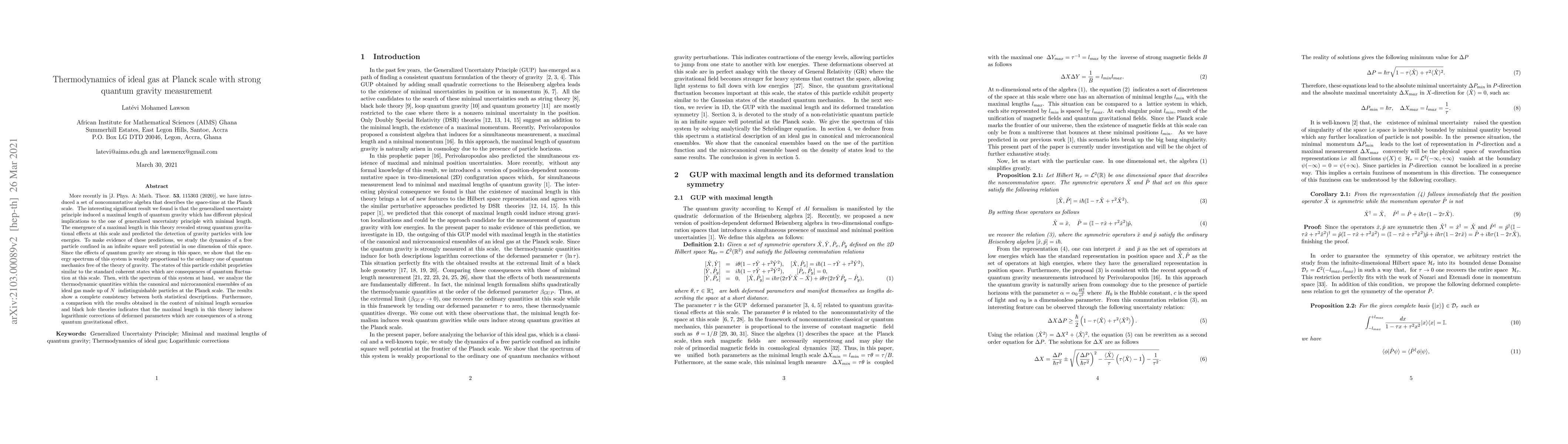 More recently in [J. Phys. A: Math. Theor. 53, 115303 (2020)], we have introduced a set of noncommutative algebra that describes the space-time at the Planck scale. The interesting significant result we found is that the generalized uncertainty principle induced a maximal length of quantum gravity which has different physical implications to the one of generalized uncertainty principle with minimal length. The emergence of a maximal length in this theory revealed strong quantum gravitational effects at this scale and predicted the detection of gravity particles with low energies. To make evidence of these predictions, we study the dynamics of a free particle confined in an infinite square well potential in one dimension of this space. Since the effects of quantum gravity are strong in this space, we show that the energy spectrum of this system is weakly proportional to the ordinary one of quantum mechanics free of the theory of gravity. The states of this particle exhibit proprieties similar to the standard coherent states which are consequences of quantum fluctuation at this scale. Then, with the spectrum of this system at hand, we analyze the thermodynamic quantities within the canonical and microcanonical ensembles of an ideal gas made up of $N$ indistinguishable particles at the Planck scale. The results show a complete consistency between both statistical descriptions. Furthermore, a comparison with the results obtained in the context of minimal length scenarios and black hole theories indicates that the maximal length in this theory induces logarithmic corrections of deformed parameters which are consequences of a strong quantum gravitational effect.