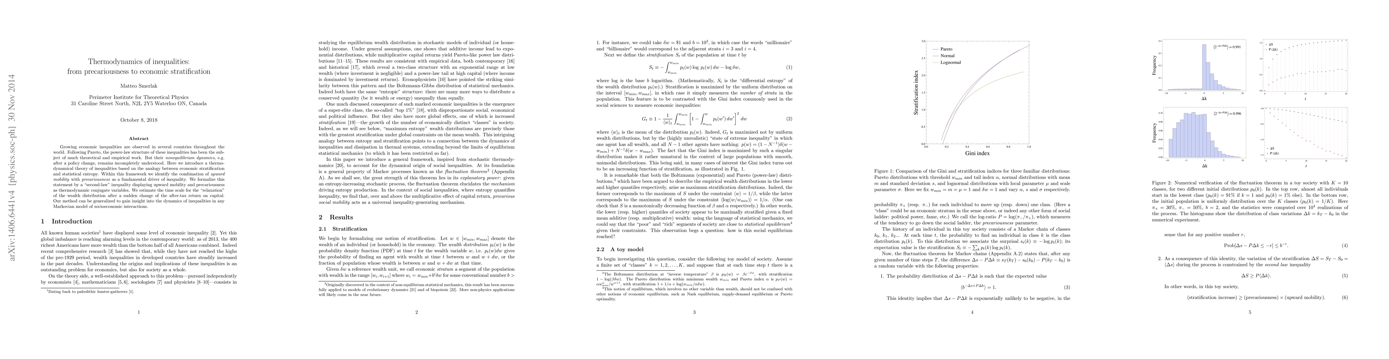 This research introduces a thermodynamic theory of economic inequalities, showing how upward mobility and precariousness drive inequality through a fundamental relationship akin to statistical entropy. It estimates the time scale for wealth distribution changes after policy interventions.