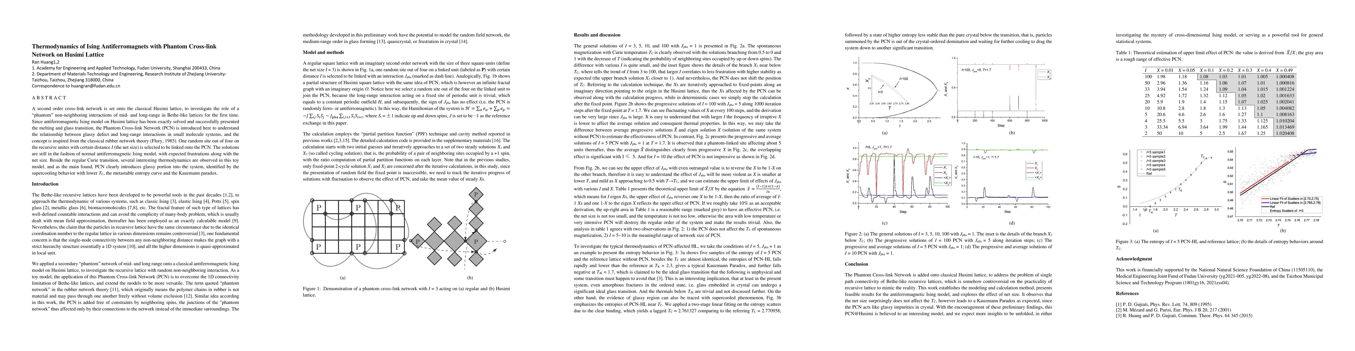 This paper explores the thermodynamics of Ising antiferromagnets on a Husimi lattice with a phantom cross-link network, revealing the impact of non-neighboring interactions. The phantom cross-link network introduces glassy behavior, evidenced by supercooling, metastable entropy, and the Kauzmann paradox.