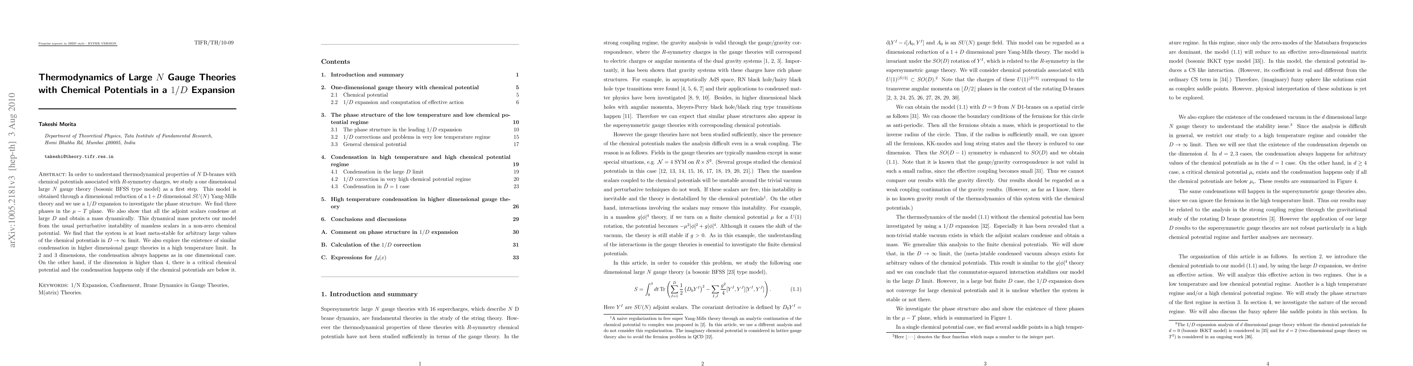 This paper investigates the thermodynamic phase structure of large N gauge theories with chemical potentials in a 1/D expansion, revealing three phases in the \mu-T plane. The study finds that adjoint scalars condense and acquire a dynamical mass, ensuring meta-stability in the large D limit, and explores similar condensation behaviors in higher dimensional gauge theories.