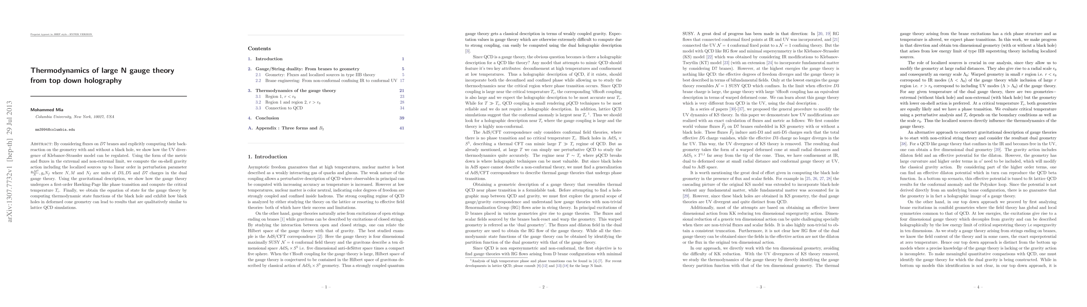 By considering fluxes on D7 branes and explicitly computing their back-reaction on the geometry with and without a black hole, we show how the UV divergence of Klebanov-Strassler model can be regulated. Using the form of the metric and fluxes in the extremal and non-extremal limit, we compute the on-shell gravity action including the localized sources up to linear order in perturbation parameter g_sM^2/N, g_sN_f where N,M and N_f are units of D3,D5 and D7 charges in the dual gauge theory. Using the gravitational description, we show how the gauge theory undergoes a first-order Hawking-Page like phase transition and compute the critical temperature T_c. Finally, we obtain the equation of state for the gauge theory by computing thermodynamic state functions of the black hole and exhibit how black holes in deformed cone geometry can lead to results that are qualitatively similar to lattice QCD simulations.