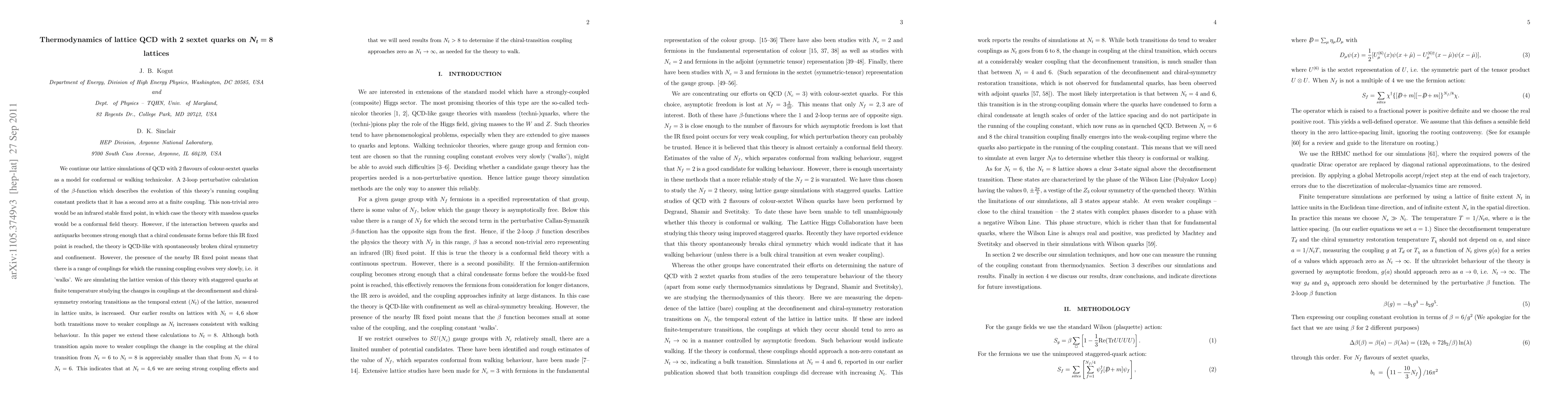 We continue our lattice simulations of QCD with 2 flavours of colour-sextet quarks as a model for conformal or walking technicolor. A 2-loop perturbative calculation of the $\beta$-function which describes the evolution of this theory's running coupling constant predicts that it has a second zero at a finite coupling. This non-trivial zero would be an infrared stable fixed point, in which case the theory with massless quarks would be a conformal field theory. However, if the interaction between quarks and antiquarks becomes strong enough that a chiral condensate forms before this IR fixed point is reached, the theory is QCD-like with spontaneously broken chiral symmetry and confinement. However, the presence of the nearby IR fixed point means that there is a range of couplings for which the running coupling evolves very slowly, i.e. it 'walks'. We are simulating the lattice version of this theory with staggered quarks at finite temperature studying the changes in couplings at the deconfinement and chiral-symmetry restoring transitions as the temporal extent ($N_t$) of the lattice, measured in lattice units, is increased. Our earlier results on lattices with $N_t=4,6$ show both transitions move to weaker couplings as $N_t$ increases consistent with walking behaviour. In this paper we extend these calculations to $N_t=8$. Although both transition again move to weaker couplings the change in the coupling at the chiral transition from $N_t=6$ to $N_t=8$ is appreciably smaller than that from $N_t=4$ to $N_t=6$. This indicates that at $N_t=4,6$ we are seeing strong coupling effects and that we will need results from $N_t > 8$ to determine if the chiral-transition coupling approaches zero as $N_t \rightarrow \infty$, as needed for the theory to walk.