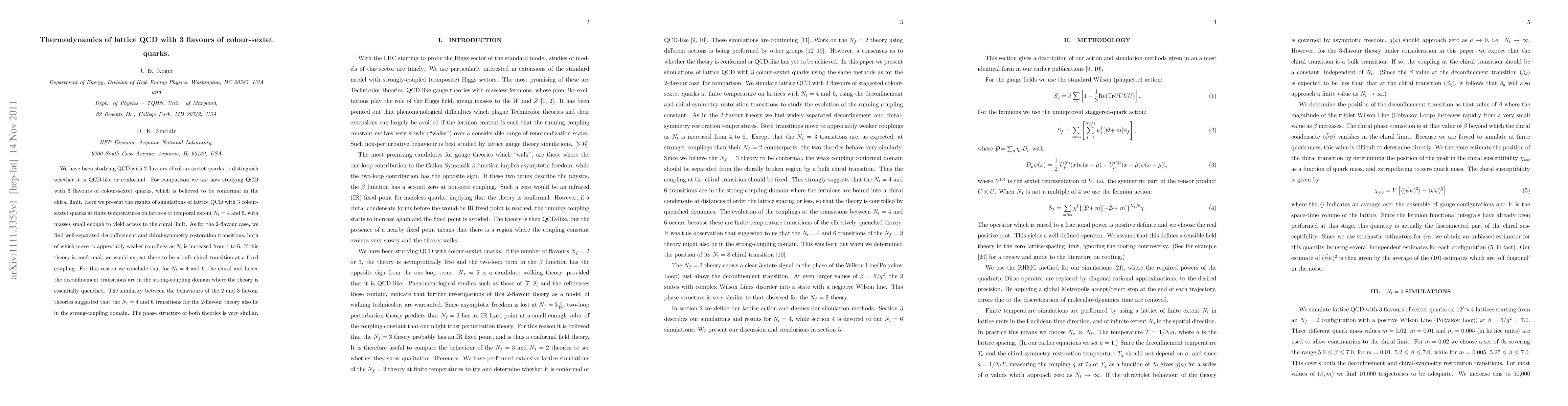 We have been studying QCD with 2 flavours of colour-sextet quarks to distinguish whether it is QCD-like or conformal. For comparison we are now studying QCD with 3 flavours of colour-sextet quarks, which is believed to be conformal in the chiral limit. Here we present the results of simulations of lattice QCD with 3 colour-sextet quarks at finite temperatures on lattices of temporal extent $N_t=4$ and 6, with masses small enough to yield access to the chiral limit. As for the 2-flavour case, we find well-separated deconfinement and chiral-symmetry restoration transitions, both of which move to appreciably weaker couplings as $N_t$ is increased from 4 to 6. If this theory is conformal, we would expect there to be a bulk chiral transition at a fixed coupling. For this reason we conclude that for $N_t=4$ and 6, the chiral and hence the deconfinement transitions are in the strong-coupling domain where the theory is essentially quenched. The similarity between the behaviours of the 2 and 3 flavour theories suggested that the $N_t=4$ and 6 transitions for the 2-flavour theory also lie in the strong-coupling domain. The phase structure of both theories is very similar.