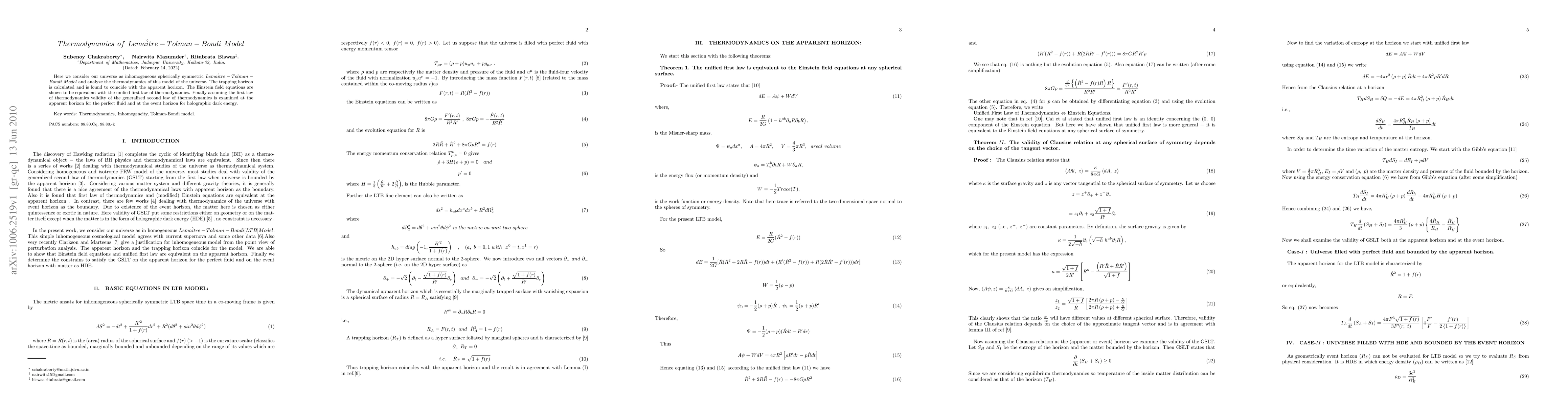 This paper investigates the thermodynamics of the inhomogeneous spherically symmetric Lemaitre-Tolman-Bondi Model of the universe, finding that the trapping horizon aligns with the apparent horizon. It demonstrates the equivalence between the Einstein field equations and the unified first law of thermodynamics, and examines the generalized second law of thermodynamics under the first law's assumption at both apparent and event horizons.