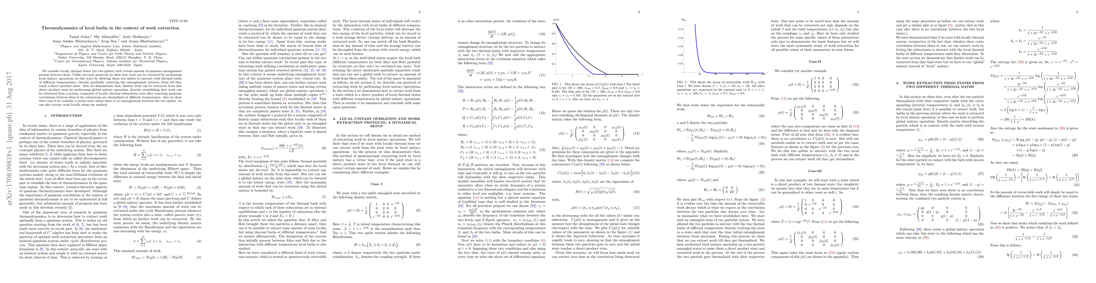 We consider locally thermal states (for two qubits) with certain amount of quantum entanglement present between them. Unlike previous protocols we show how work can be extracted by performing local unitary operations on this state by allowing those two qubits to interact with thermal baths of different temperatures, thereby gradually removing the entanglement between them till they reach a direct product state. Also we demonstrate that, further work can be extracted from this direct product state by performing global unitary operation, thereby establishing that work can be extracted from a system composed of locally thermal subsystems even after removing quantum correlations between them if the subsystems are thermalized at different temperatures. Also we show that even if we consider a initial state where there is no entanglement between the two qubits, we can also extract work locally using our method.