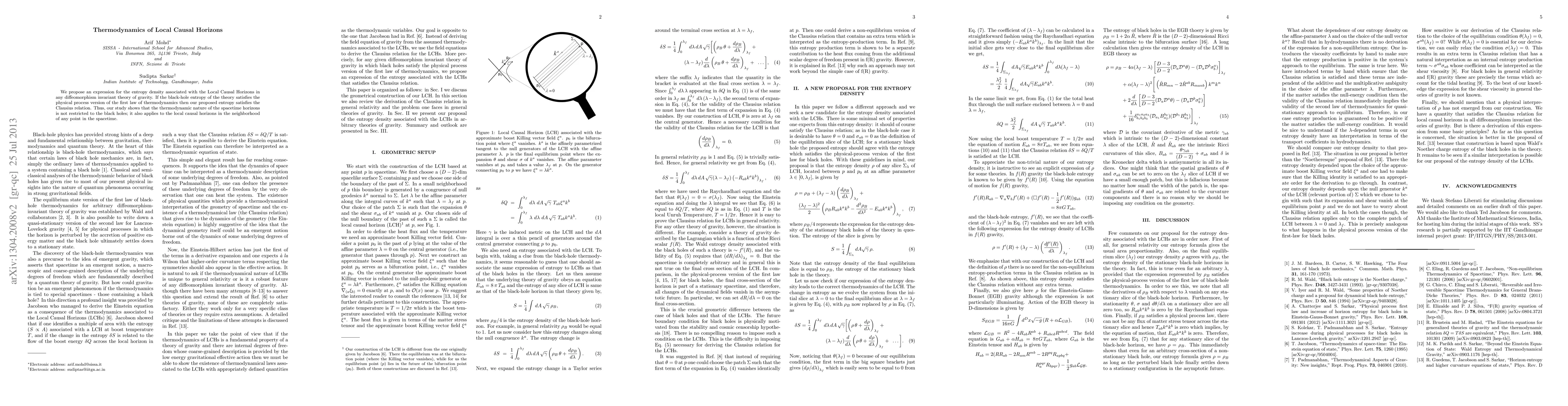 This paper proposes an entropy density formula for Local Causal Horizons in diffeomorphism invariant gravity theories, showing that the thermodynamic nature of spacetime horizons extends beyond black holes to encompass local causal horizons. The proposed entropy obeys the Clausius relation when the black-hole entropy adheres to the first law of thermodynamics.