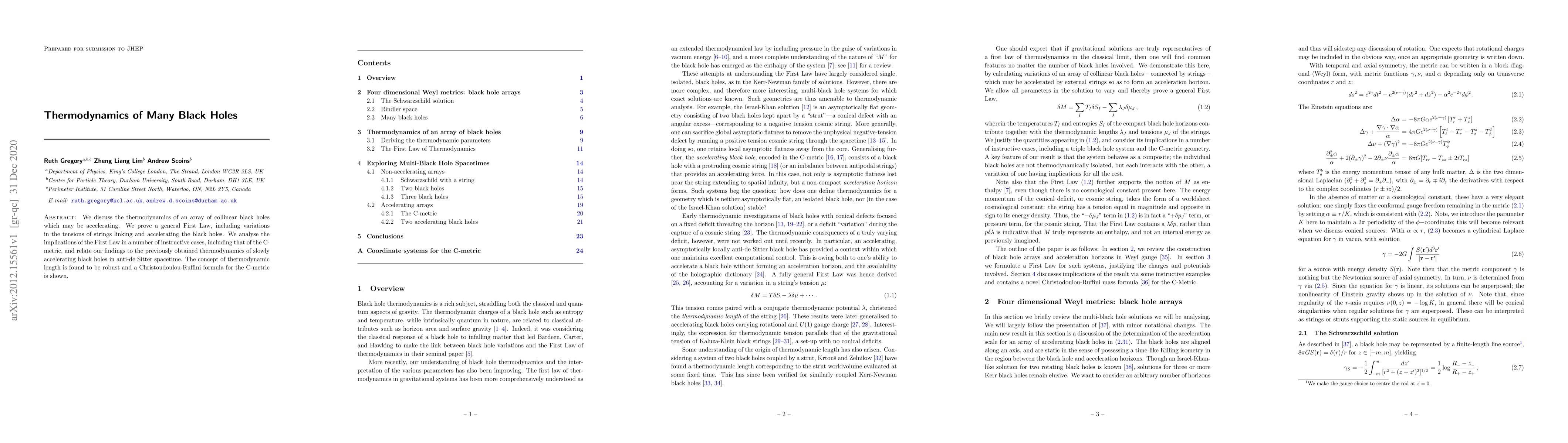 This paper explores the thermodynamics of an array of collinear black holes, proving a general First Law that accounts for string tensions linking and accelerating them. It analyzes implications in various cases, including the C-metric, and relates findings to the thermodynamics of slowly accelerating black holes in anti-de Sitter spacetime, confirming the robustness of thermodynamic length and deriving a Christoudoulou-Ruffini formula for the C-metric.