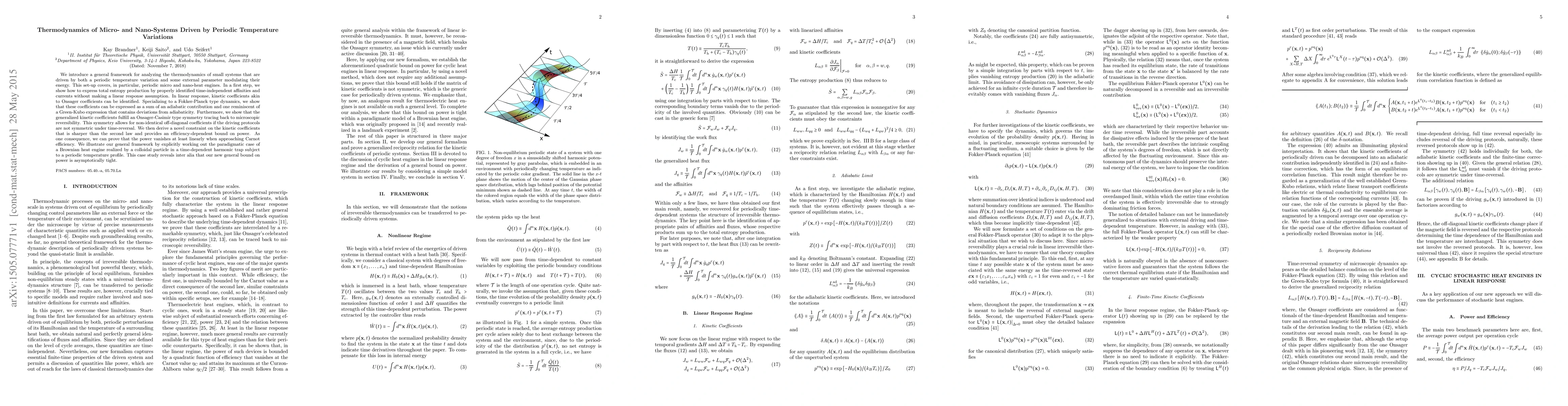 We introduce a general framework for analyzing the thermodynamics of small systems that are driven by both a periodic temperature variation and some external parameter modulating their energy. This set-up covers, in particular, periodic micro and nano-heat engines. In a first step, we show how to express total entropy production by properly identified time-independent affinities and currents without making a linear response assumption. In linear response, kinetic coefficients akin to Onsager coefficients can be identified. Specializing to a Fokker-Planck type dynamics, we show that these coefficients can be expressed as a sum of an adiabatic contribution and one reminiscent of a Green-Kubo expression that contains deviations from adiabaticity. Furthermore, we show that the generalized kinetic coefficients fulfill an Onsager-Casimir type symmetry tracing back to microscopic reversibility. This symmetry allows for non-identical off-diagonal coefficients if the driving protocols are not symmetric under time-reversal. We then derive a novel constraint on the kinetic coefficients that is sharper than the second law and provides an efficiency-dependent bound on power. As one consequence, we can prove that the power vanishes at least linearly when approaching Carnot efficiency. We illustrate our general framework by explicitly working out the paradigmatic case of a Brownian heat engine realized by a colloidal particle in a time-dependent harmonic trap subject to a periodic temperature profile. This case study reveals inter alia that our new general bound on power is asymptotically tight.