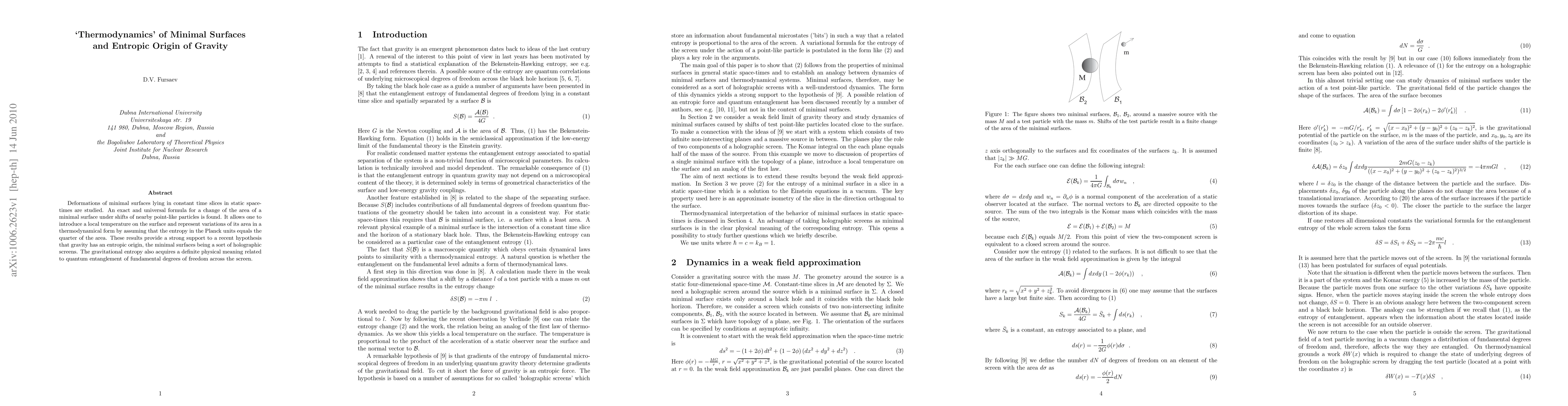 Deformations of minimal surfaces lying in constant time slices in static space-times are studied. An exact and universal formula for a change of the area of a minimal surface under shifts of nearby point-like particles is found. It allows one to introduce a local temperature on the surface and represent variations of its area in a thermodynamical form by assuming that the entropy in the Planck units equals the quarter of the area. These results provide a strong support to a recent hypothesis that gravity has an entropic origin, the minimal surfaces being a sort of holographic screens. The gravitational entropy also acquires a definite physical meaning related to quantum entanglement of fundamental degrees of freedom across the screen.