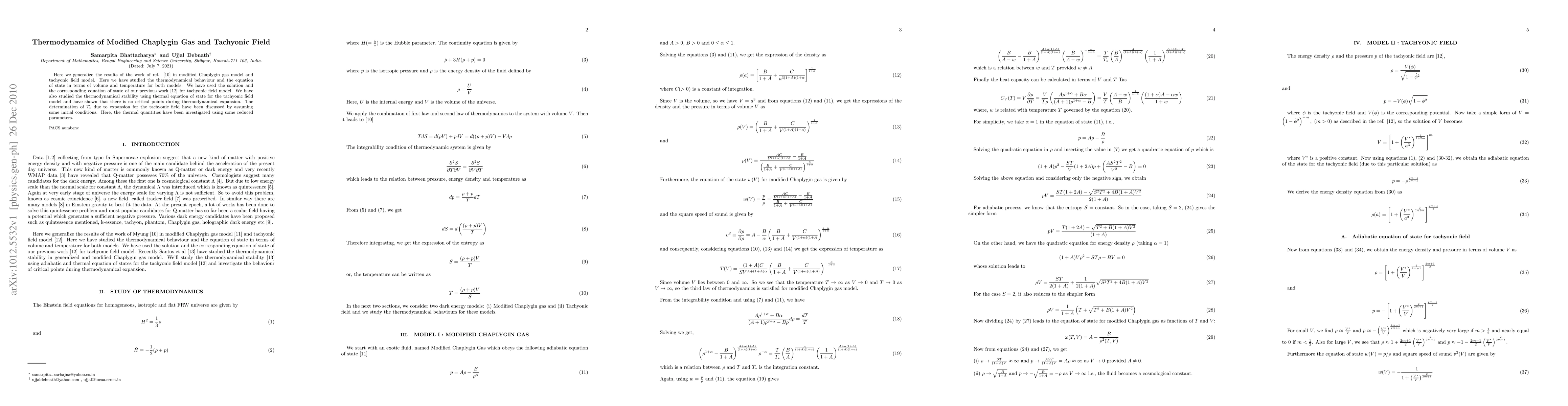 This paper generalizes the thermodynamic behavior and equation of state for modified Chaplygin gas and tachyonic field models, utilizing previous results from ref. [12]. It investigates thermodynamic stability and finds no critical points during expansion, determining thermal quantities through reduced parameters.