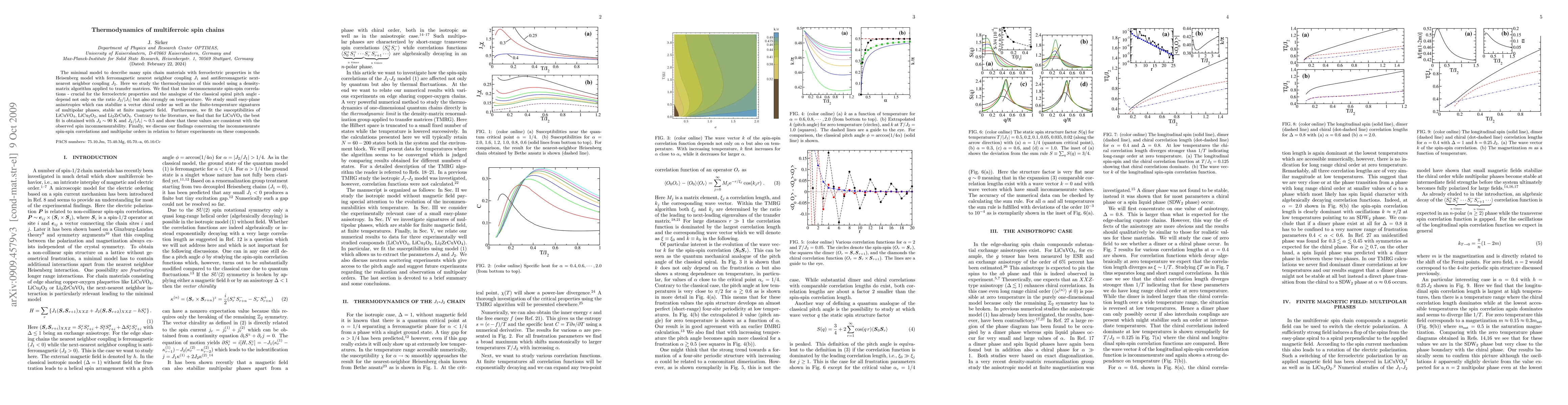 The minimal model to describe many spin chain materials with ferroelectric properties is the Heisenberg model with ferromagnetic nearest neighbor coupling J1 and antiferromagnetic next-nearest neighbor coupling J2. Here we study the thermodynamics of this model using a density-matrix algorithm applied to transfer matrices. We find that the incommensurate spin-spin correlations - crucial for the ferroelectric properties and the analogue of the classical spiral pitch angle - depend not only on the ratio J2/|J1| but also strongly on temperature. We study small easy-plane anisotropies which can stabilize a vector chiral order as well as the finite-temperature signatures of multipolar phases, stable at finite magnetic field. Furthermore, we fit the susceptibilities of LiCuVO4, LiCu2O2, and Li2ZrCuO4. Contrary to the literature, we find that for LiCuVO4 the best fit is obtained with J2 ~ 90 K and J2/|J1| ~ 0.5 and show that these values are consistent with the observed spin incommensurability. Finally, we discuss our findings concerning the incommensurate spin-spin correlations and multipolar orders in relation to future experiments on these compounds.