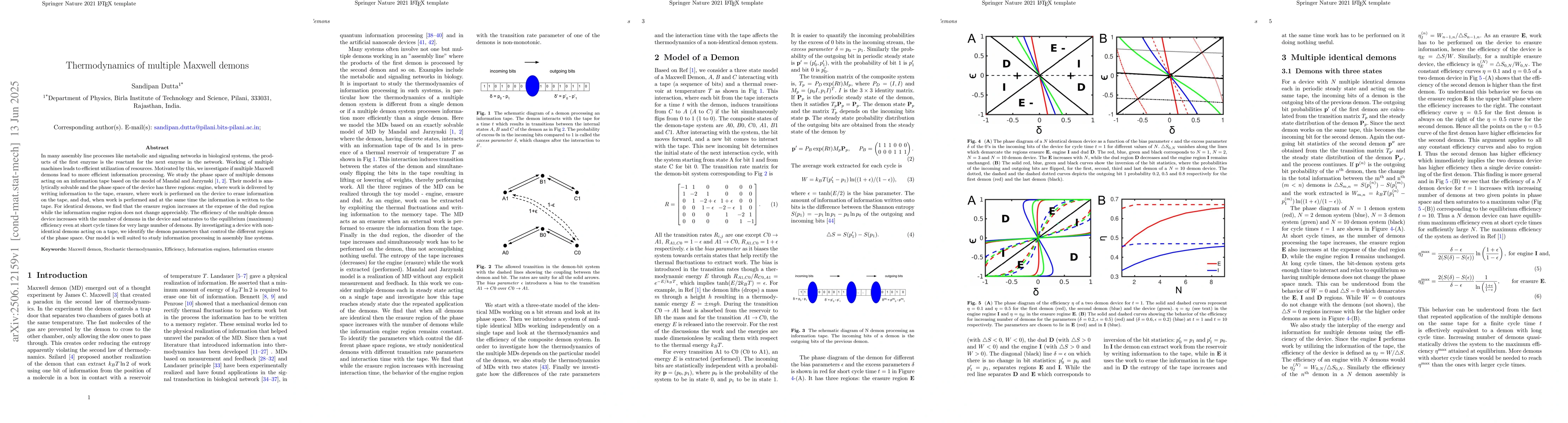 This research explores the efficiency of multiple Maxwell demons in information processing, inspired by biological systems. It finds that as the number of demons increases, efficiency improves and approaches maximum efficiency, even at short cycle times. The study also examines nonidentical demons, identifying parameters that influence different regions of the phase space, suggesting potential for studying information processing in assembly line systems.