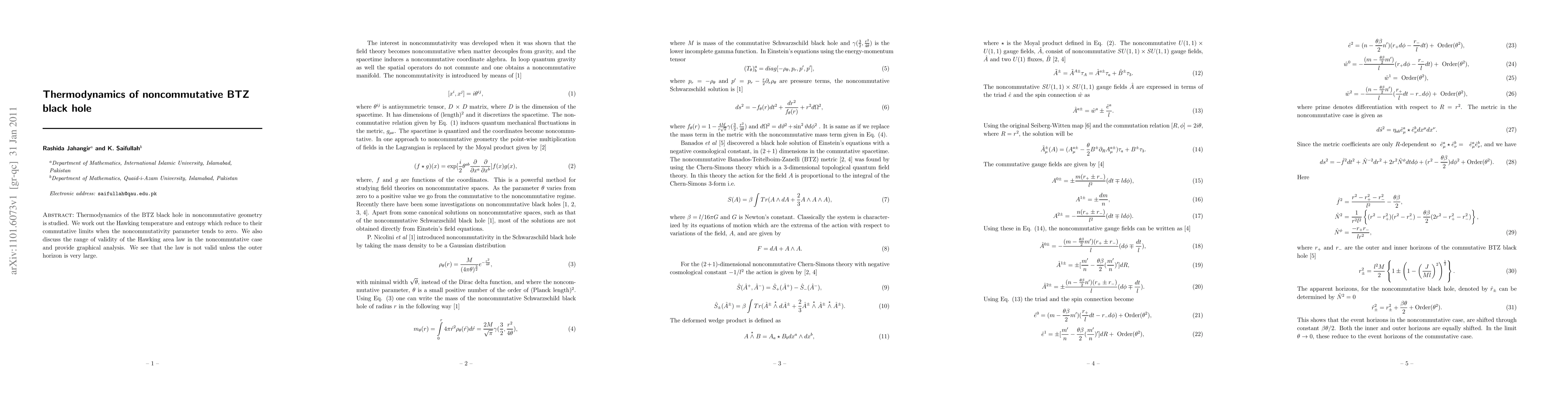 The work extends previous research on noncommutative black hole thermodynamics by specifically analyzing the BTZ black hole, revealing how noncommutativity affects its thermodynamic properties and the validity of the Hawking area law.