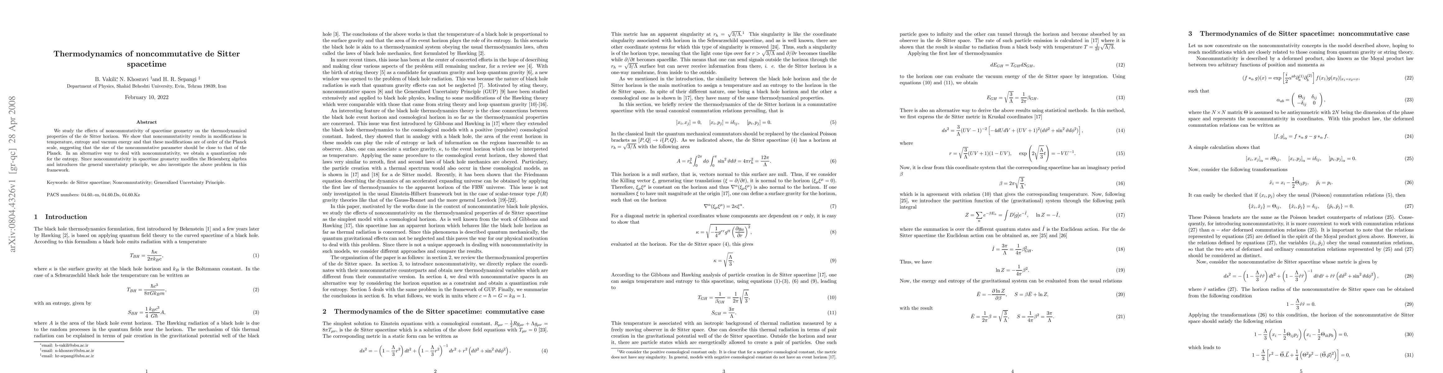 We study the effects of noncommutativity of spacetime geometry on the thermodynamical properties of the de Sitter horizon. We show that noncommutativity results in modifications in temperature, entropy and vacuum energy and that these modifications are of order of the Planck scale, suggesting that the size of the noncommutative parameter should be close to that of the Planck. In an alternative way to deal with noncommutativity, we obtain a quantization rule for the entropy. Since noncommutativity in spacetime geometry modifies the Heisenberg algebra and introduces the general uncertainty principle, we also investigate the above problem in this framework.