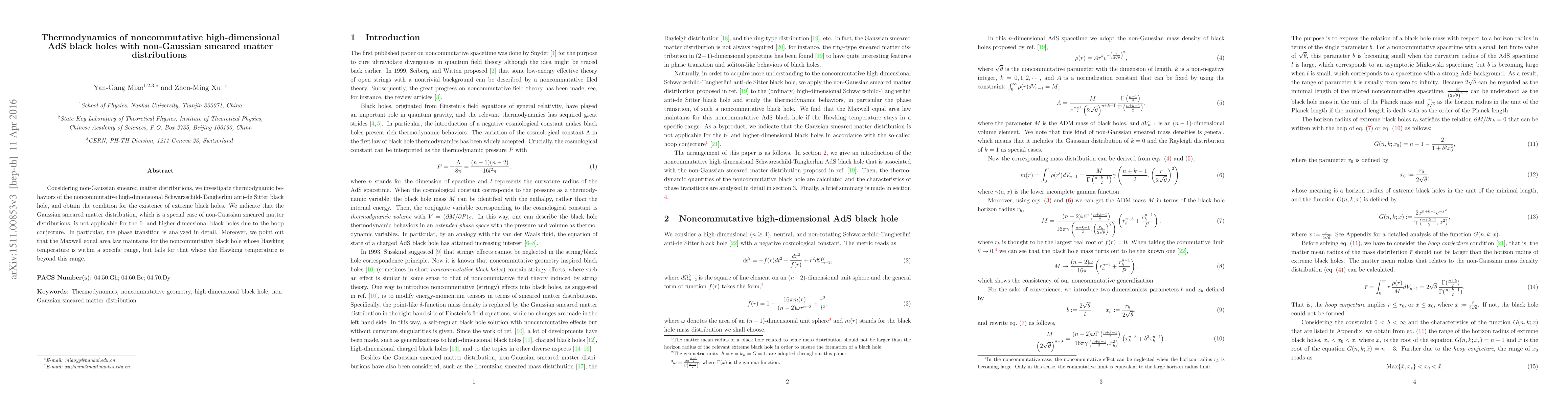 This paper explores the thermodynamics of noncommutative high-dimensional AdS black holes with non-Gaussian smeared matter distributions, revealing conditions for extreme black holes and showing that Gaussian distributions are inapplicable for 6-dimensional and higher-dimensional black holes. It also examines phase transitions and notes the Maxwell equal area law's validity within a specific Hawking temperature range.