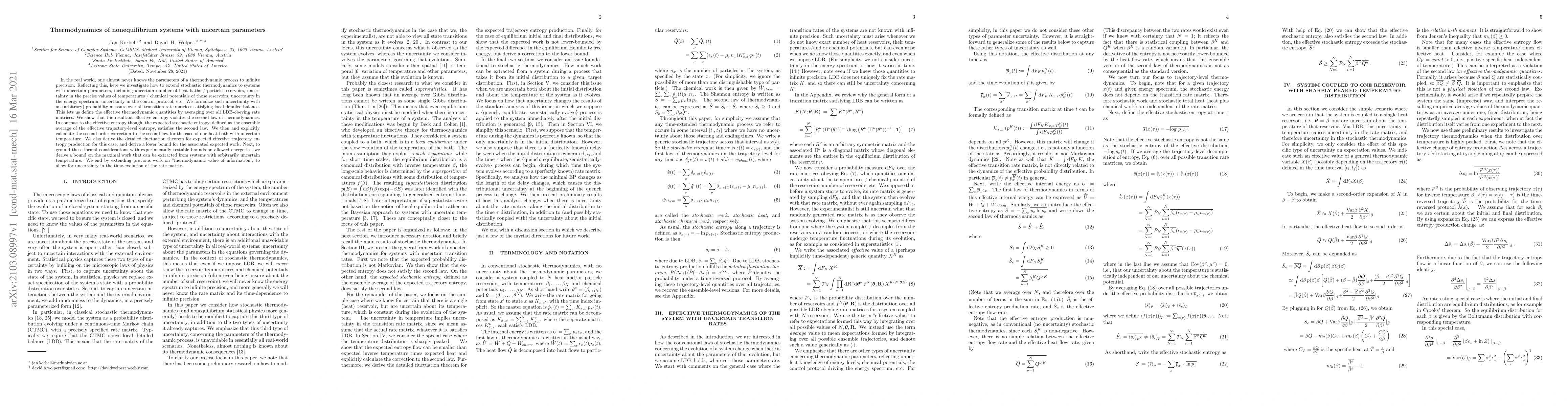 This paper extends stochastic thermodynamics to nonequilibrium systems with uncertain parameters, showing that effective entropy violates the second law while expected stochastic entropy adheres to it. It derives a second-order correction for the second law and a detailed fluctuation theorem for systems with uncertain temperature, providing bounds on maximal extractable work and extending the thermodynamic value of information to account for uncertainty in rate matrix evolution.