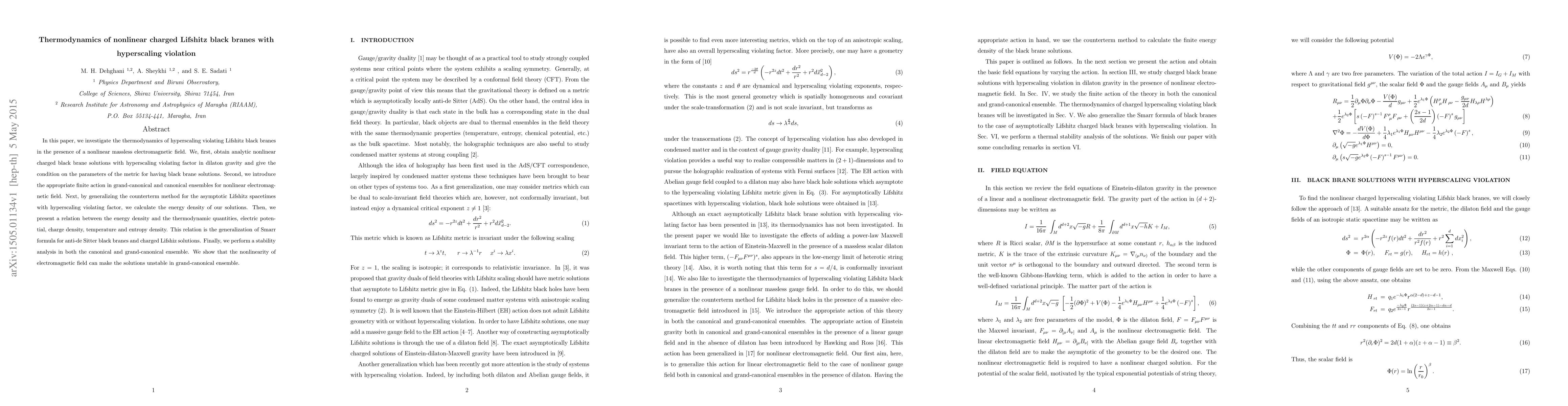 This paper explores the thermodynamics of nonlinear charged Lifshitz black branes with hyperscaling violation, deriving analytic solutions and calculating energy density. It generalizes the Smarr formula and finds that nonlinearity can induce instability in the grand-canonical ensemble.