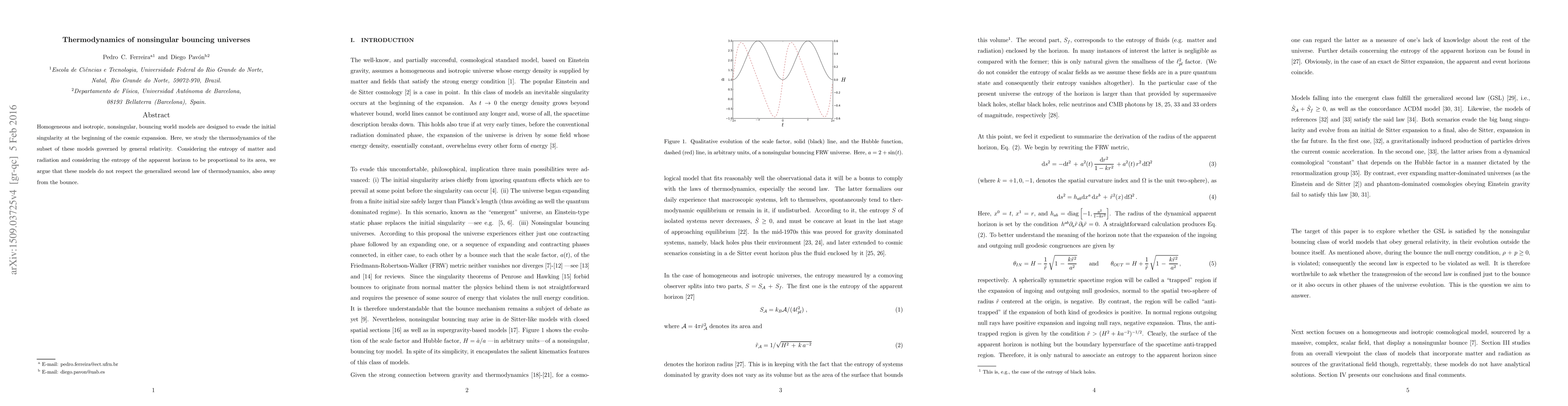 Homogeneous and isotropic, nonsingular, bouncing world models are designed to evade the initial singularity at the beginning of the cosmic expansion. Here, we study the thermodynamics of the subset of these models governed by general relativity. Considering the entropy of matter, radiation and that the entropy of the apparent horizon is proportional to its area, we argue that these models do not respect the generalised second law of thermodynamics, also away from the bounce.