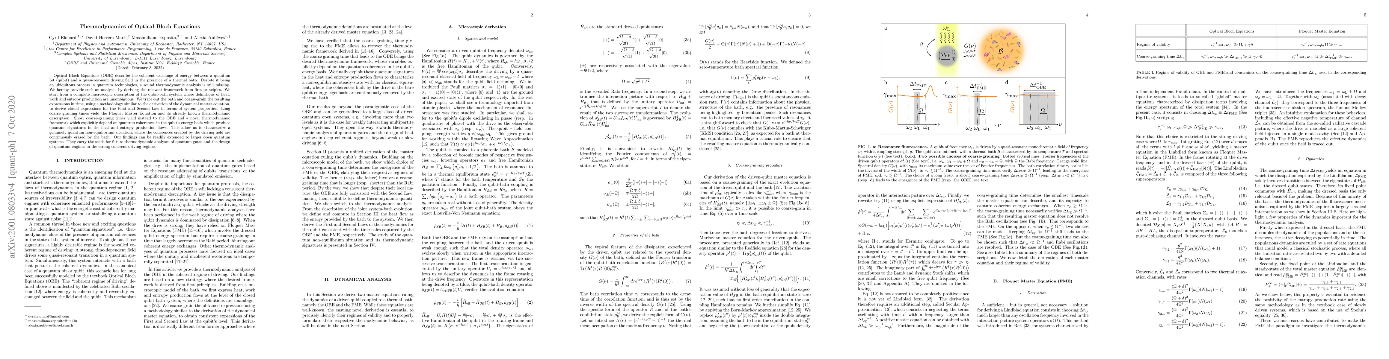 Optical Bloch Equations (OBE) describe the coherent exchange of energy between a quantum bit (qubit) and a quasi-resonant driving field in the presence of a thermal bath. Despite it being an ubiquitous process in quantum technologies, a sound thermodynamic analysis is still missing. We hereby provide such an analysis, by deriving the relevant framework from first principles. Building on a microscopic model of the bath, we first express heat, work and entropy production for the closed qubit-bath system where these definitions are unambiguous. We coarse-grain the obtained expressions, using a methodology similar to the derivation of the dynamical master equation and giving rise to consistent expressions of the First and Second Law. We verify that long coarse graining times yield the Floquet Master Equation and its already known thermodynamic description. Conversely, short coarse-graining times yield the OBE and its consistent thermodynamic framework, whose variables explicitly depend on the quantum coherences in the qubit's energy basis. These quantum signatures in the heat and in the entropy production flows allow us to characterize a genuinely quantum non-equilibrium situation, where the coherences created by the driving field are continuously erased by the bath. Our findings can be readily extended to larger open quantum systems. They carry the seeds for future thermodynamic analyses of quantum gates and the design of quantum engines in the strong coherent driving regime.