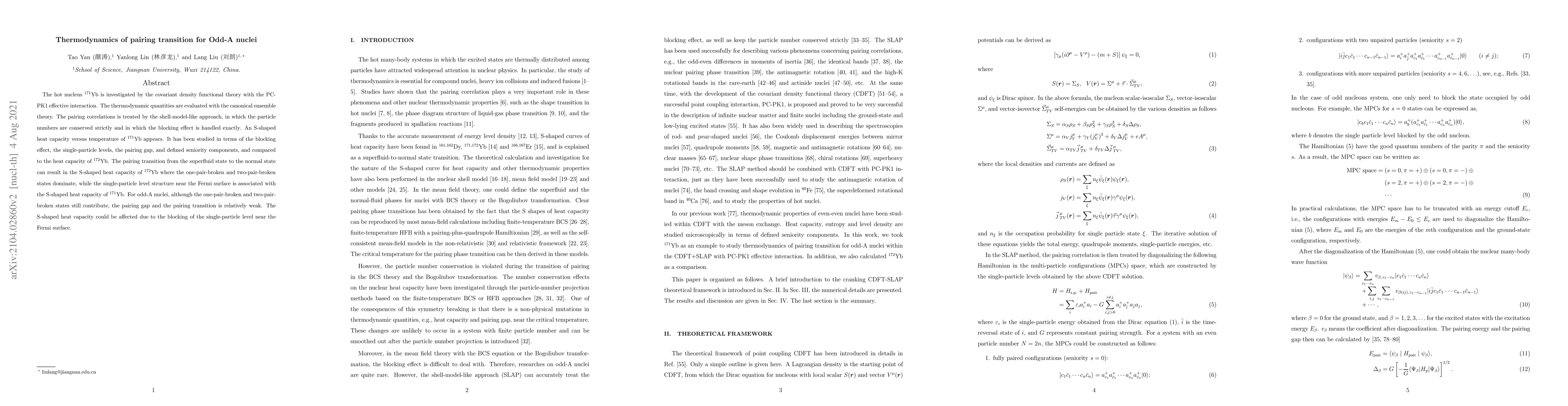 The hot nucleus $^{171}$Yb is investigated by the covariant density functional theory with the PC-PK1 effective interaction. The thermodynamic quantities are evaluated with the canonical ensemble theory. The pairing correlations is treated by the shell-model-like approach, in which the particle numbers are conserved strictly and in which the blocking effect is handled exactly. An S-shaped heat capacity versus temperature of $^{171}$Yb appears. It has been studied in terms of the blocking effect, the single-particle levels, the pairing gap, and defined seniority components, and compared to the heat capacity of $^{172}$Yb. The pairing transition from the superfluid state to the normal state can result in the S-shaped heat capacity of $^{172}$Yb where the one-pair-broken and two-pair-broken states dominate, while the single-particle level structure near the Fermi surface is associated with the S-shaped heat capacity of $^{171}$Yb. For odd-A nuclei, although the one-pair-broken and two-pair-broken states still contribute, the pairing gap and the pairing transition is relatively weak. The S-shaped heat capacity could be affected due to the blocking of the single-particle level near the Fermi surface.
