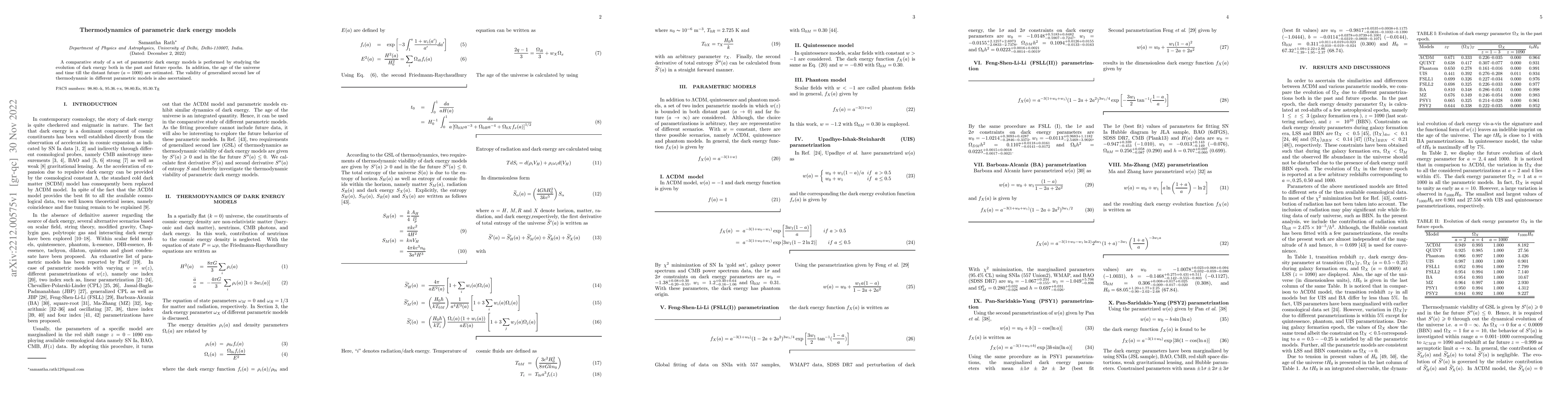 This paper compares various parametric dark energy models, analyzing their evolution and estimating the universe's age and future time to $a=1000$. It also examines the validity of the generalized second law of thermodynamics within these models.