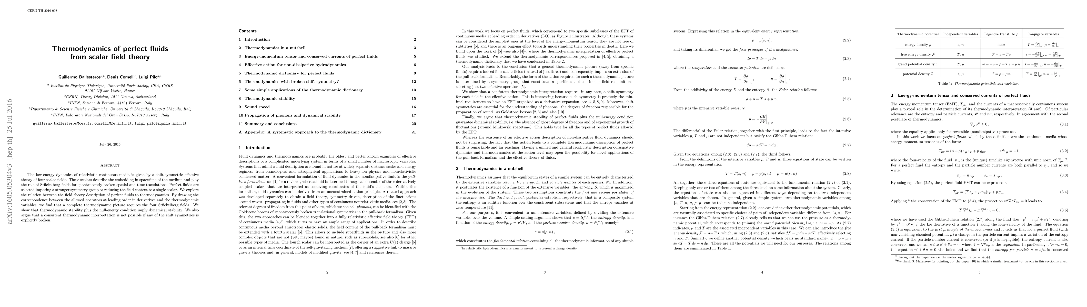 This paper explores the thermodynamics of perfect fluids through a scalar field theory, demonstrating that four St\"uckelberg fields are necessary for a complete thermodynamic description. It establishes that thermodynamic and dynamical stability are inherently linked, and argues against the explicit breaking of shift symmetries for a consistent thermodynamic interpretation.