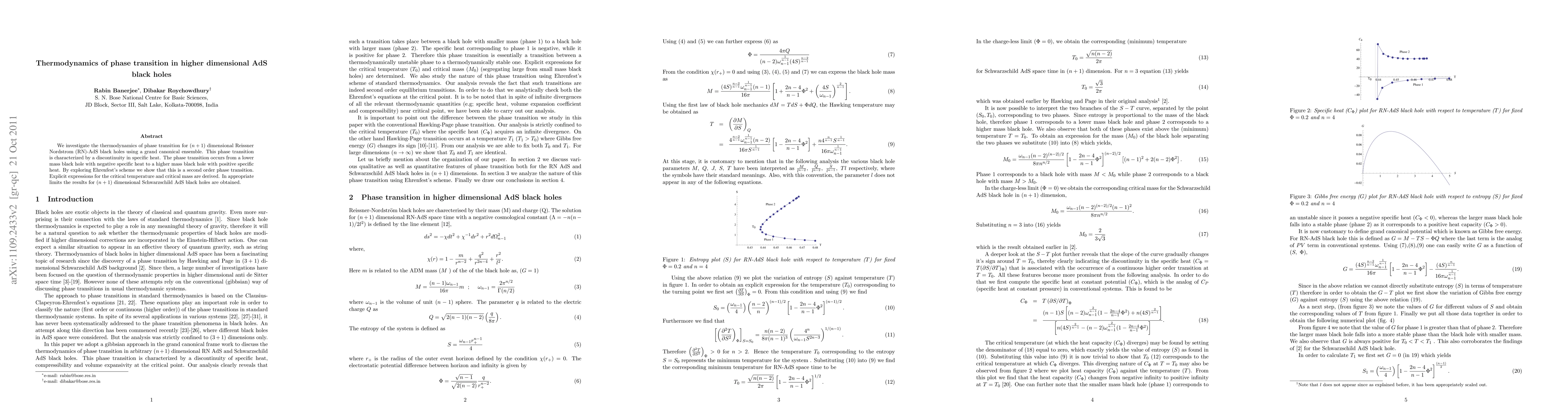 This paper explores the thermodynamics of phase transitions in $(n+1)$-dimensional Reissner-Nordstrom-AdS black holes, revealing a second-order phase transition marked by a specific heat discontinuity. Critical temperature and mass expressions are derived, and results align with those for $(n+1)$-dimensional Schwarzschild AdS black holes in specific limits.
