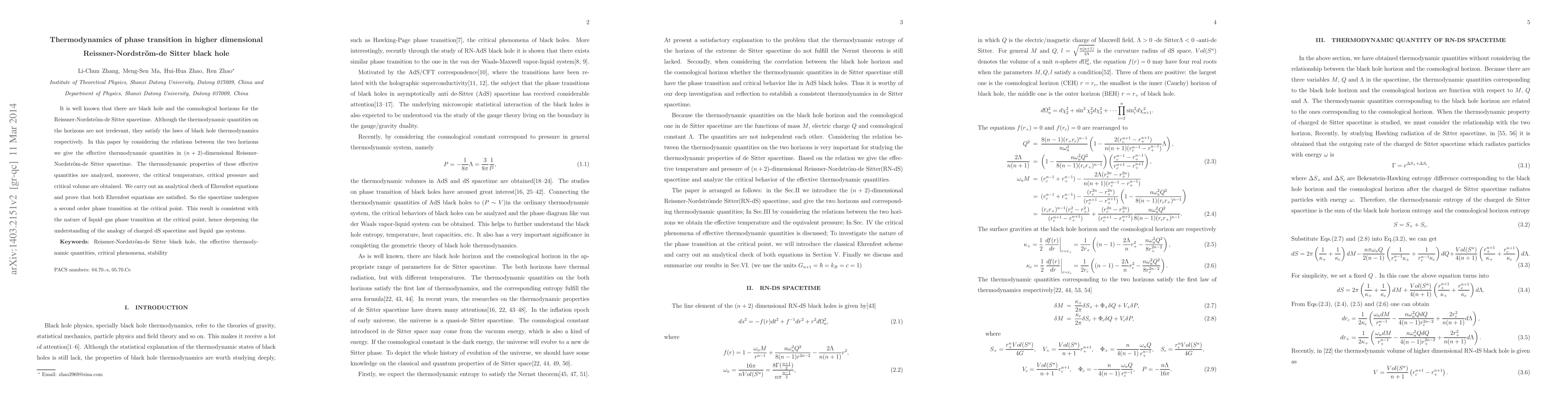 This paper investigates the thermodynamics of the phase transition in higher dimensional Reissner-Nordström-de Sitter black holes, deriving effective thermodynamic quantities and demonstrating a second-order phase transition analogous to liquid-gas systems at a critical point, validated by Ehrenfest equations.