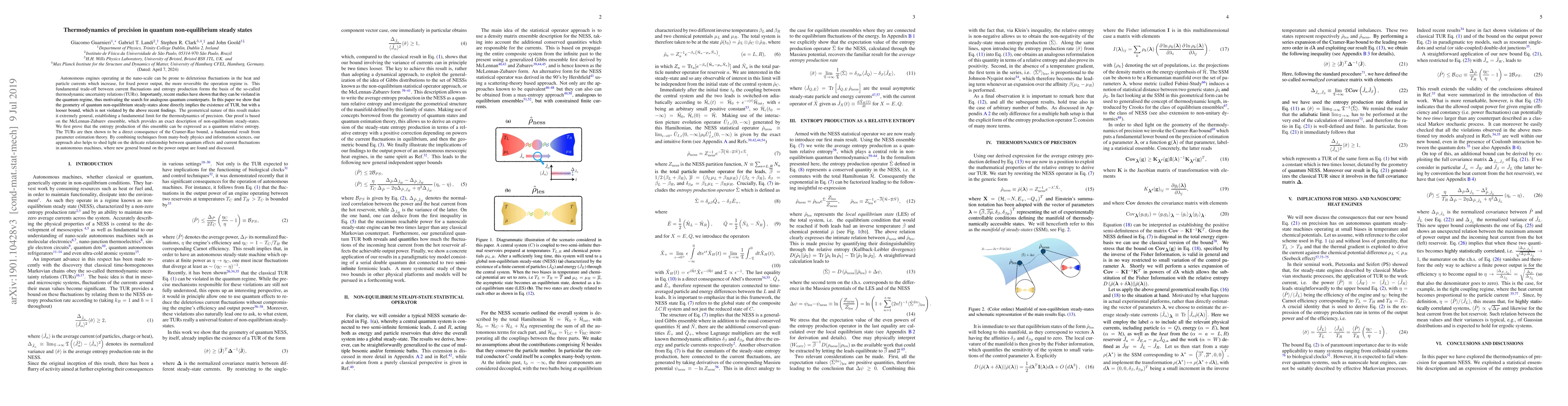 Autonomous engines operating at the nano-scale can be prone to deleterious fluctuations in the heat and particle currents which increase, for fixed power output, the more reversible the operation regime is. This fundamental trade-off between current fluctuations and entropy production forms the basis of the recently formulated thermodynamic uncertainty relations (TURs). However, these relations have so far only been derived for classical Markovian systems and can be violated in the quantum regime. In this paper we show that the geometry of quantum non-equilibrium steady-states alone, already directly implies the existence of a TUR, but with a looser bound. The geometrical nature of this result makes it extremely general, establishing a fundamental limit for the thermodynamics of precision. Our proof is based on the McLennan-Zubarev ensemble, which provides an exact description of non-equilibrium steady-states. We first prove that the entropy production of this ensemble can be expressed as a quantum relative entropy. The TURs are then shown to be a direct consequence of the quantum Cramer-Rao bound, a fundamental result from parameter estimation theory. By combining techniques from many-body physics and information sciences, our approach also helps to shed light on the delicate relationship between quantum effects and current fluctuations in autonomous machines.