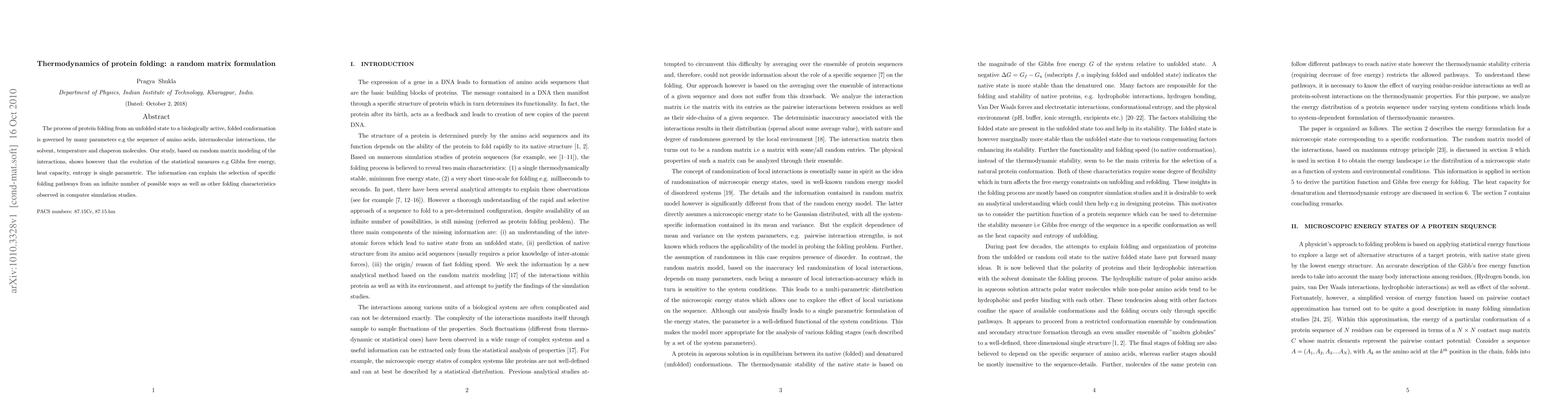 This paper employs random matrix modeling to demonstrate that protein folding thermodynamics can be described by a single parameter, explaining the evolution of statistical measures like Gibbs free energy and entropy, and predicting specific folding pathways.