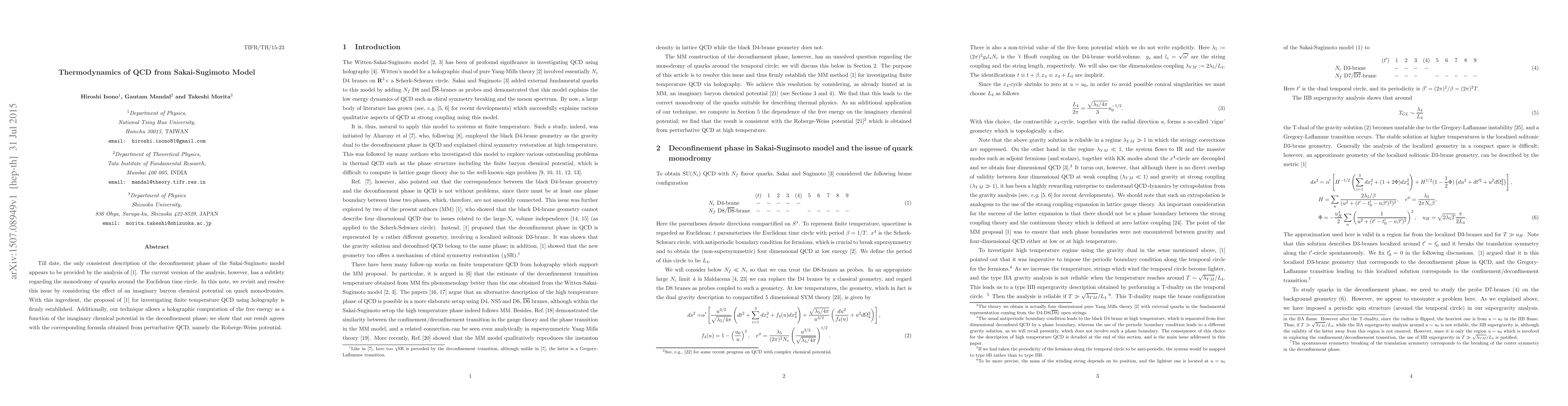 Till date, the only consistent description of the deconfinement phase of the Sakai-Sugimoto model appears to be provided by the analysis of [1] (arXiv:1107.4048). The current version of the analysis, however, has a subtlety regarding the monodromy of quarks around the Euclidean time circle. In this note, we revisit and resolve this issue by considering the effect of an imaginary baryon chemical potential on quark monodromies. With this ingredient, the proposal of [1] for investigating finite temperature QCD using holography is firmly established. Additionally, our technique allows a holographic computation of the free energy as a function of the imaginary chemical potential in the deconfinement phase; we show that our result agrees with the corresponding formula obtained from perturbative QCD, namely the Roberge-Weiss potential.