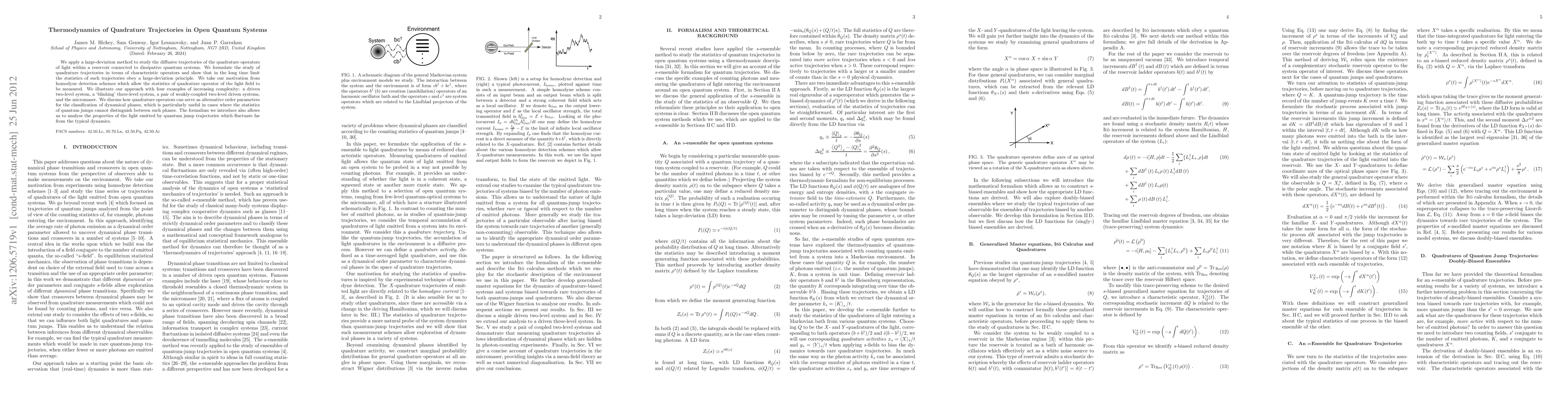 We apply a large-deviation method to study the diffusive trajectories of the quadrature operators of light within a reservoir connected to dissipative quantum systems. We formulate the study of quadrature trajectories in terms of characteristic operators and show that in the long time limit the statistics of such trajectories obey a large-deviation principle. We take our motivation from homodyne detection schemes which allow the statistics of quadrature operator of the light field to be measured. We illustrate our approach with four examples of increasing complexity: a driven two-level system, a `blinking' three-level system, a pair of weakly-coupled two-level driven systems, and the micromaser. We discuss how quadrature operators can serve as alternative order parameters for the classification of dynamical phases, which is particularly useful in cases where the statistics of quantum jumps cannot distinguish between such phases. The formalism we introduce also allows us to analyse the properties of the light emitted by quantum jump trajectories which fluctuate far from the typical dynamics.