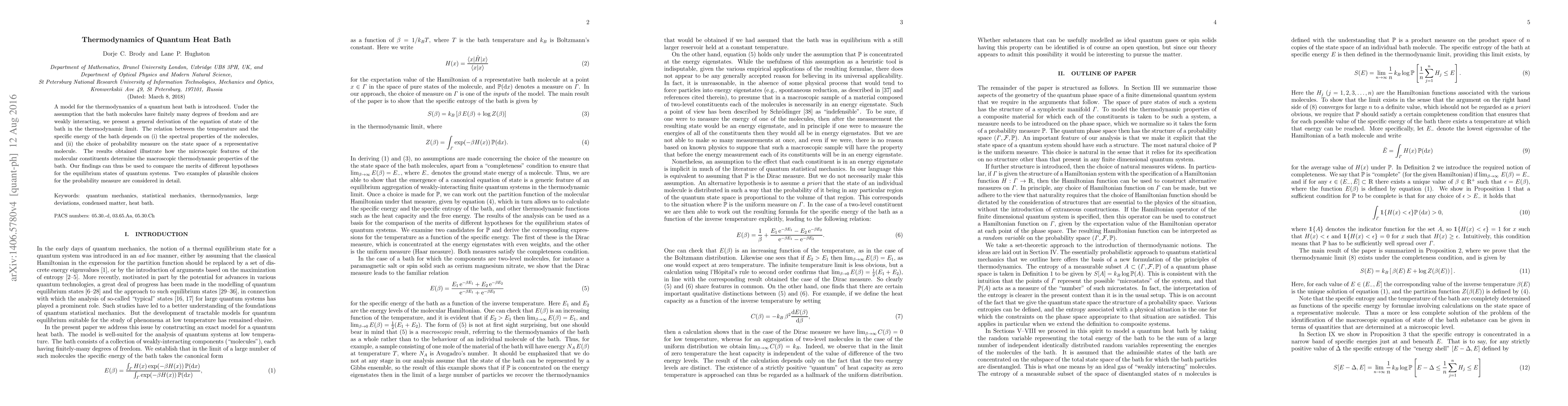 The paper presents a model for the thermodynamics of a quantum heat bath, deriving the equation of state in the thermodynamic limit under the assumption of finitely many degrees of freedom and weak interactions among bath molecules. It uses Cramér's method in the theory of large deviations for a general derivation.