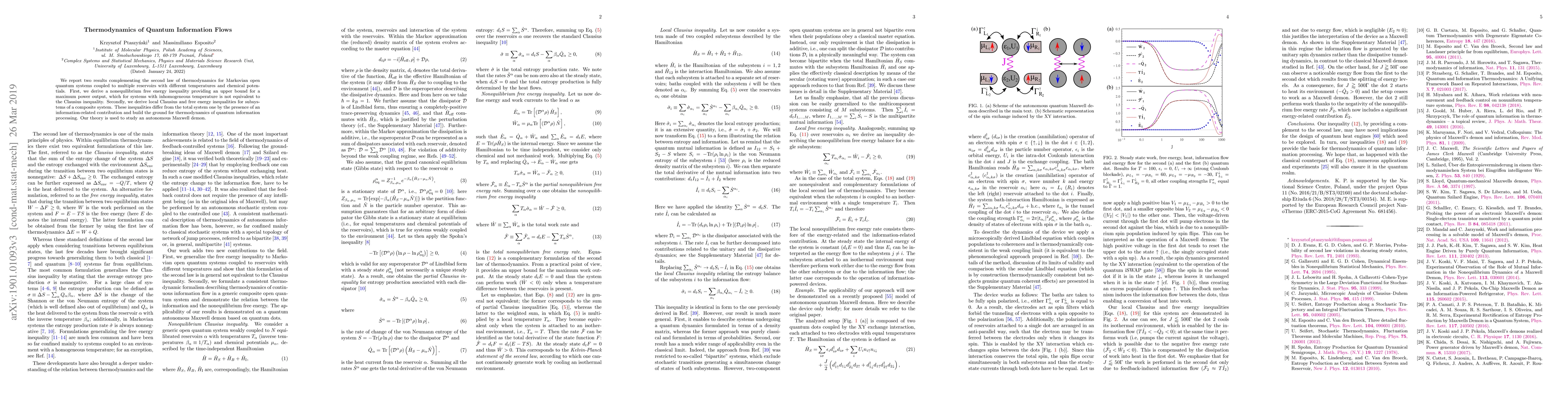 This paper develops new thermodynamic inequalities for quantum systems interacting with multiple reservoirs, establishing nonequilibrium free energy bounds for maximum power output and local Clausius inequalities that include information-related terms. These results lay the foundation for the thermodynamics of quantum information processing and are applied to analyze an autonomous Maxwell demon.