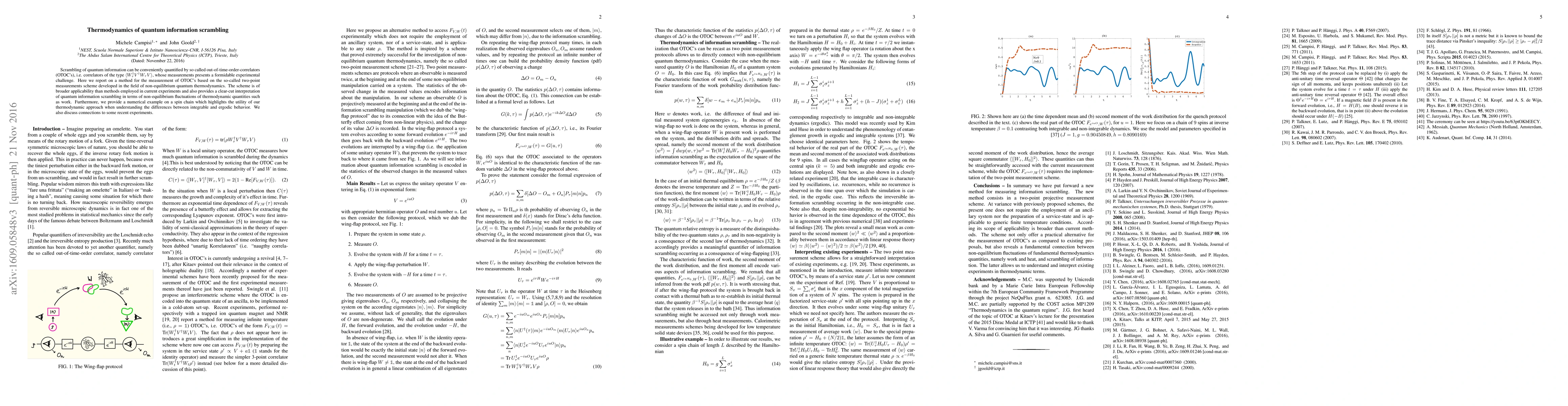 Scrambling of quantum information can be conveniently quantified by so called out-of-time-order-correlators (OTOCs), whose measurements presents a formidable experimental challenge. Here we report on a method for the measurement of OTOCs based on the so-called two-point measurements scheme developed in the field of non-equilibrium quantum thermodynamics. The scheme is of broader applicability than methods employed in current experiments and also provides a clear-cut interpretation of quantum information scrambling in terms of non-equilibrium fluctuations of thermodynamic quantities such as work. Furthermore, we provide a numerical example on a spin chain which highlights the utility of our thermodynamic approach when understanding the differences between integrable and ergodic behavior. We also discuss connections to some recent experiments.