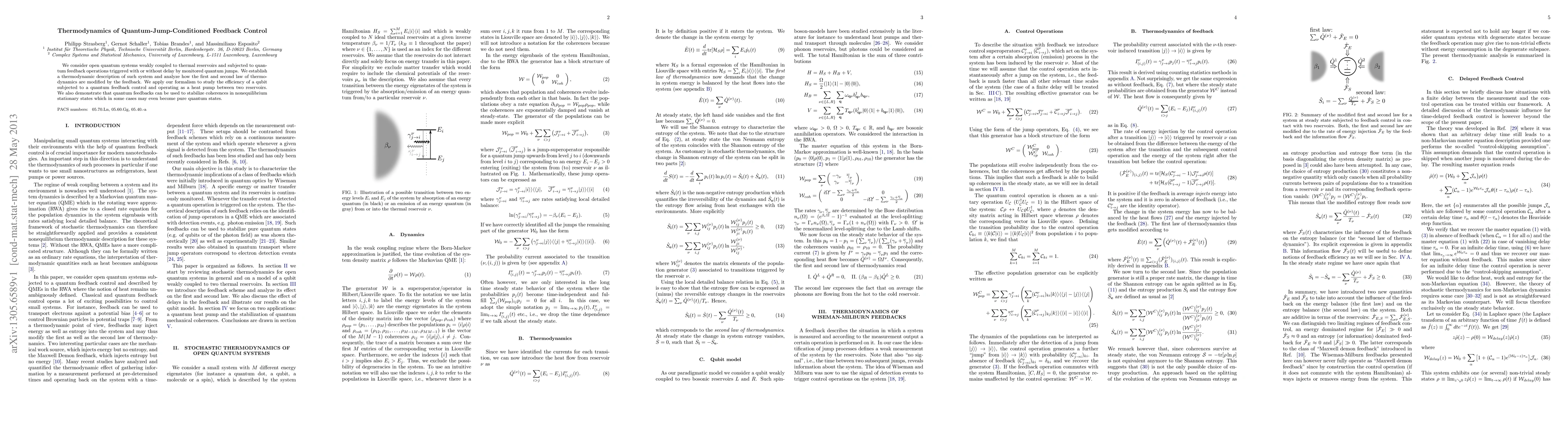 We consider open quantum systems weakly coupled to thermal reservoirs and subjected to quantum feedback operations triggered with or without delay by monitored quantum jumps. We establish a thermodynamic description of such system and analyze how the first and second law of thermodynamics are modified by the feedback. We apply our formalism to study the efficiency of a qubit subjected to a quantum feedback control and operating as a heat pump between two reservoirs. We also demonstrate that quantum feedbacks can be used to stabilize coherences in nonequilibrium stationary states which in some cases may even become pure quantum states.