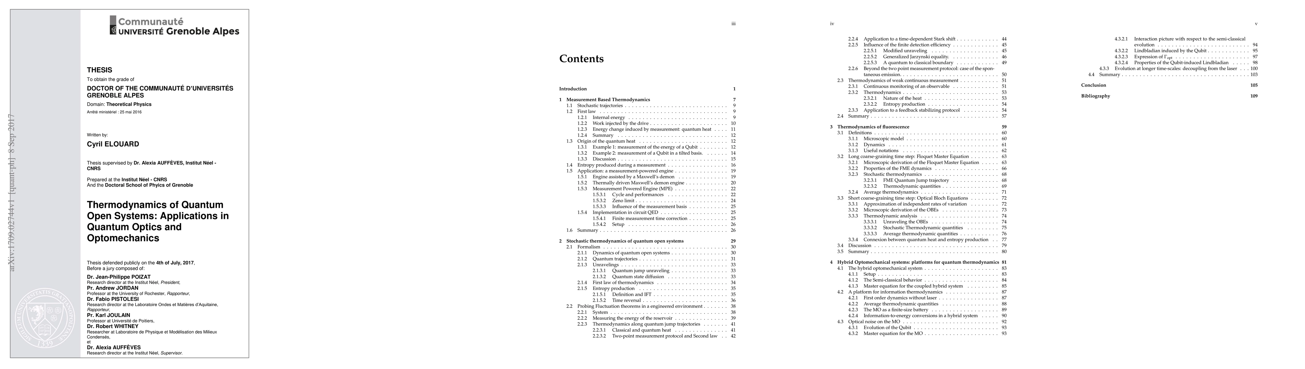 This research develops a formalism for the stochastic thermodynamics of quantum open systems, emphasizing the role of quantum measurement in generating randomness and entropy. It applies this framework to quantum optics and optomechanics, demonstrating its potential to characterize quantum heat engines and explore new thermodynamic processes.