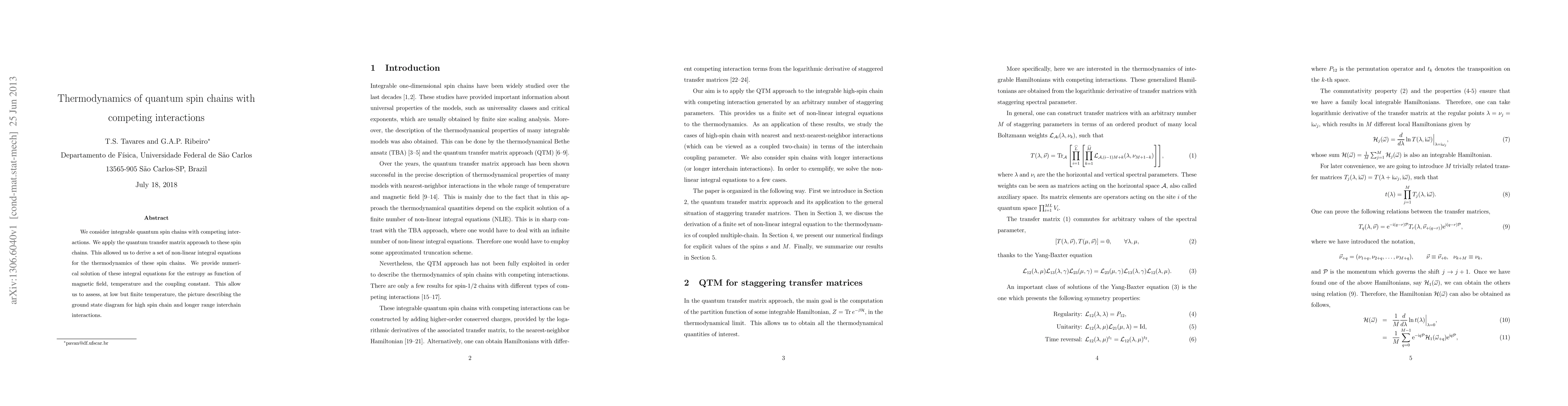 This paper uses the quantum transfer matrix approach to derive non-linear integral equations for the thermodynamics of integrable quantum spin chains with competing interactions, providing numerical solutions for entropy and assessing the ground state diagram at low temperatures.