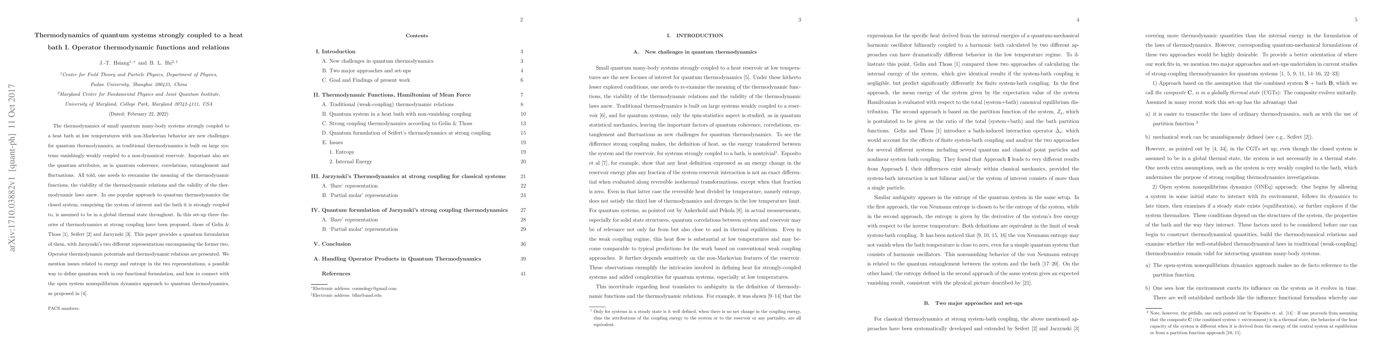 This paper explores the thermodynamics of small quantum systems strongly coupled to a heat bath, focusing on operator thermodynamic functions and relations. It proposes quantum formulations of three prominent theories, addressing energy, entropy, and quantum work, and connects these to nonequilibrium dynamics in quantum thermodynamics.