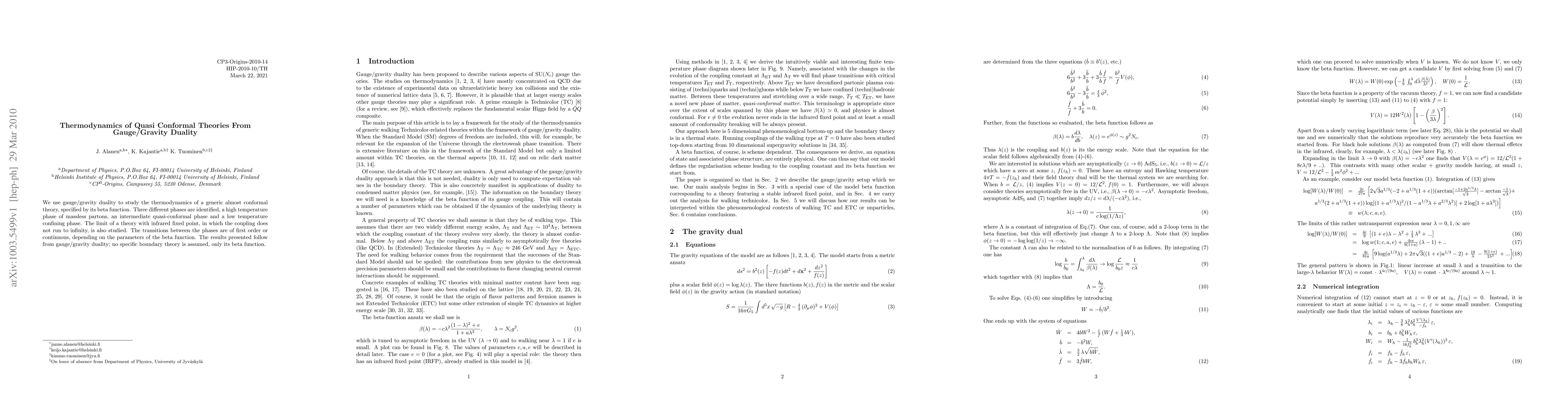 This paper employs gauge/gravity duality to explore the thermodynamics of quasi-conformal theories, identifying three phases: massless partons at high temperature, a quasi-conformal phase, and a confining phase at low temperature. The study reveals phase transitions that can be either first-order or continuous, depending on the theory's beta function parameters.