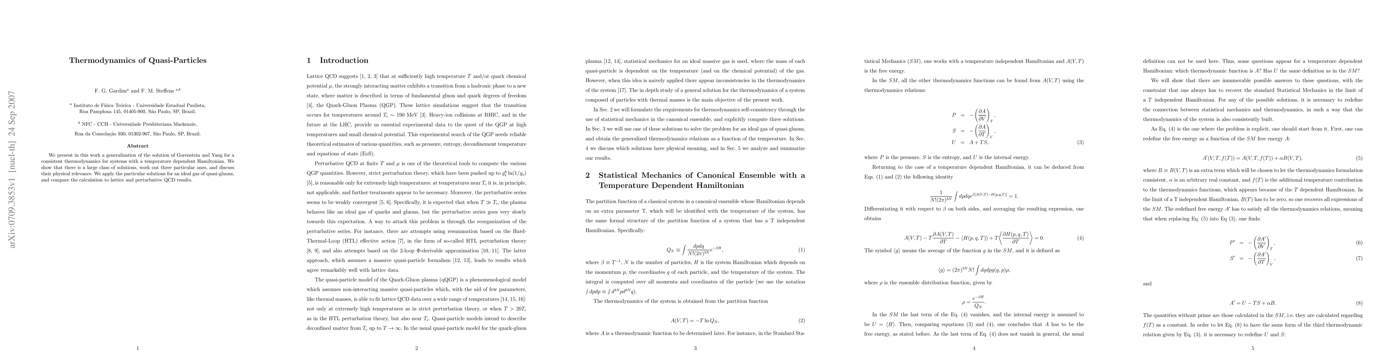 We present in this work a generalization of the solution of Gorenstein and Yang for a consistent thermodynamics for systems with a temperature dependent Hamiltonian. We show that there is a large class of solutions, work out three particular ones, and discuss their physical relevance. We apply the particular solutions for an ideal gas of quasi-gluons, and compare the calculation to lattice and perturbative QCD results.